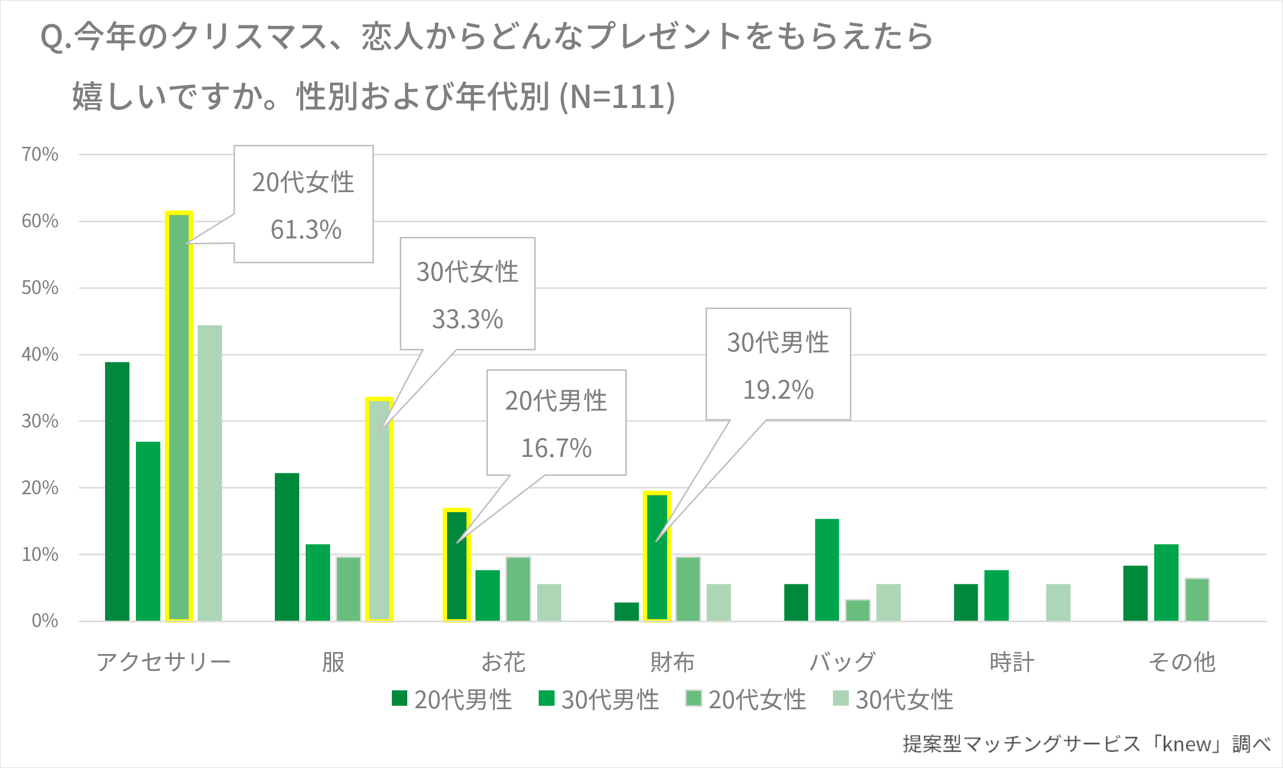男女および20代30代のすべての回答者属性において、「恋人からもらえたら嬉しいプレゼント」第1位は「アクセサリー」でした。