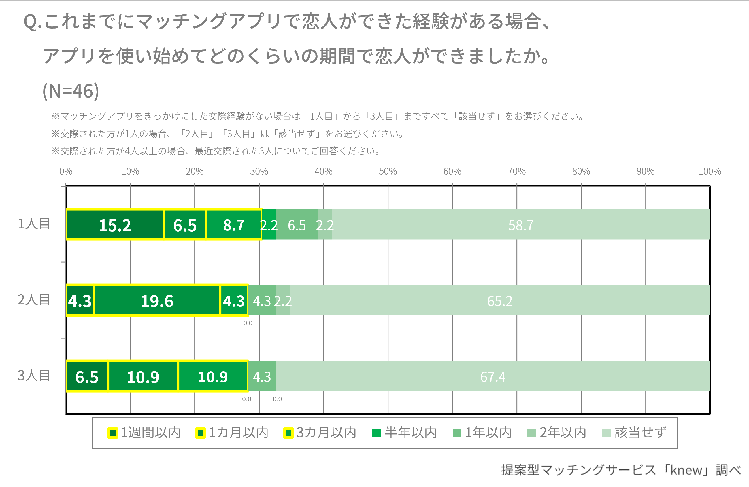 - マッチングアプリ利用者の3人に1人が「3ヶ月以内」に、5人に1人が「1ヶ月以内」に恋人ができた経験がある