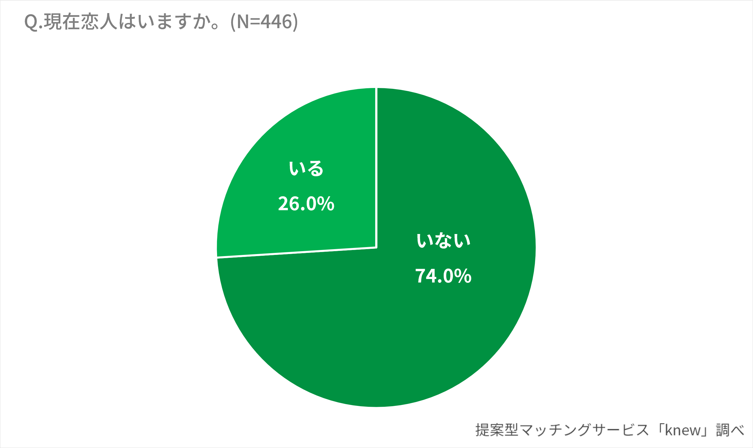 この結果を見ると、20代30代にとってクリスマスはもはや恋人と過ごす日ではなくなったように見えますが、回答者の「恋人の有無」を確認すると「恋人がいない」人が74.0%(330人)でした。