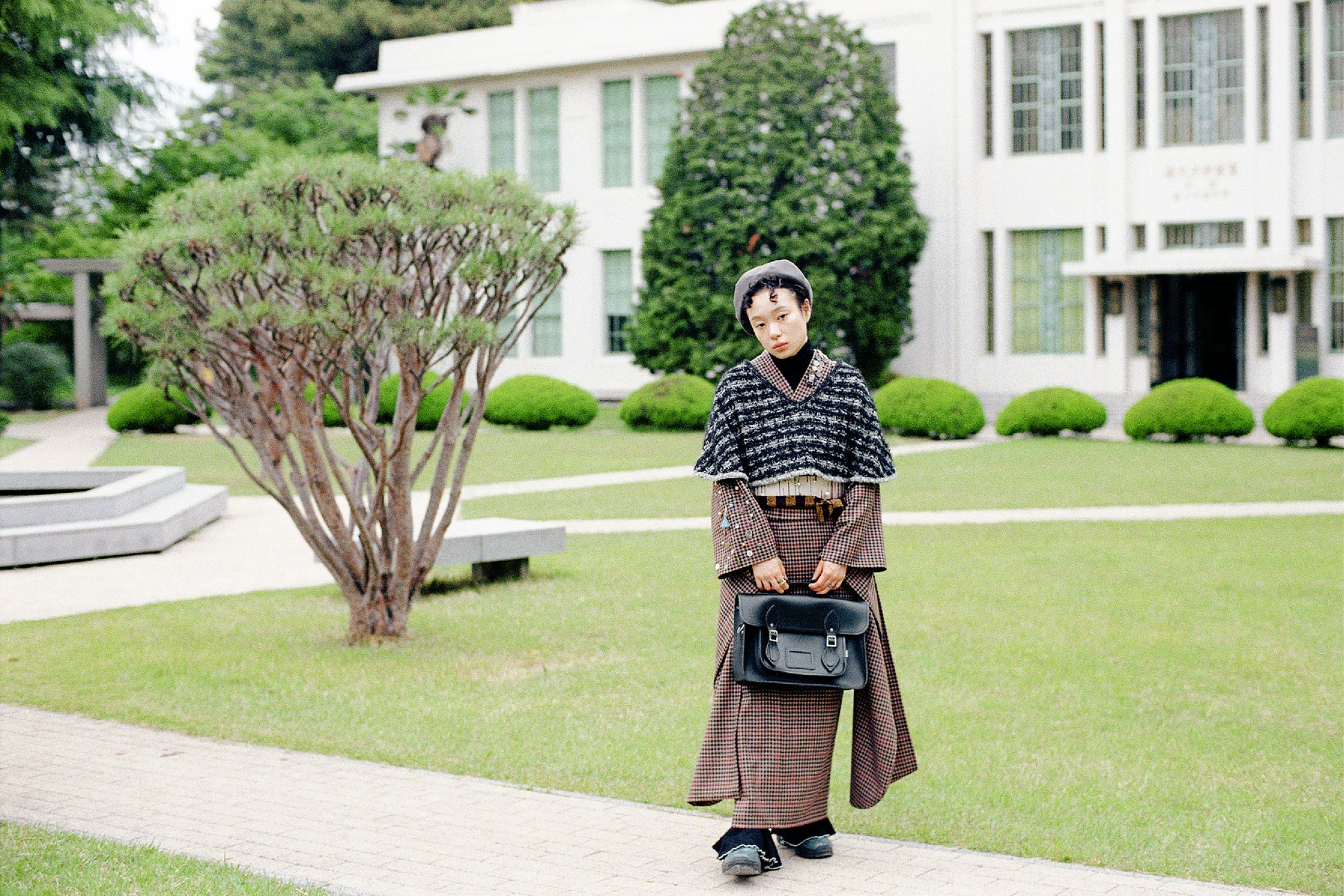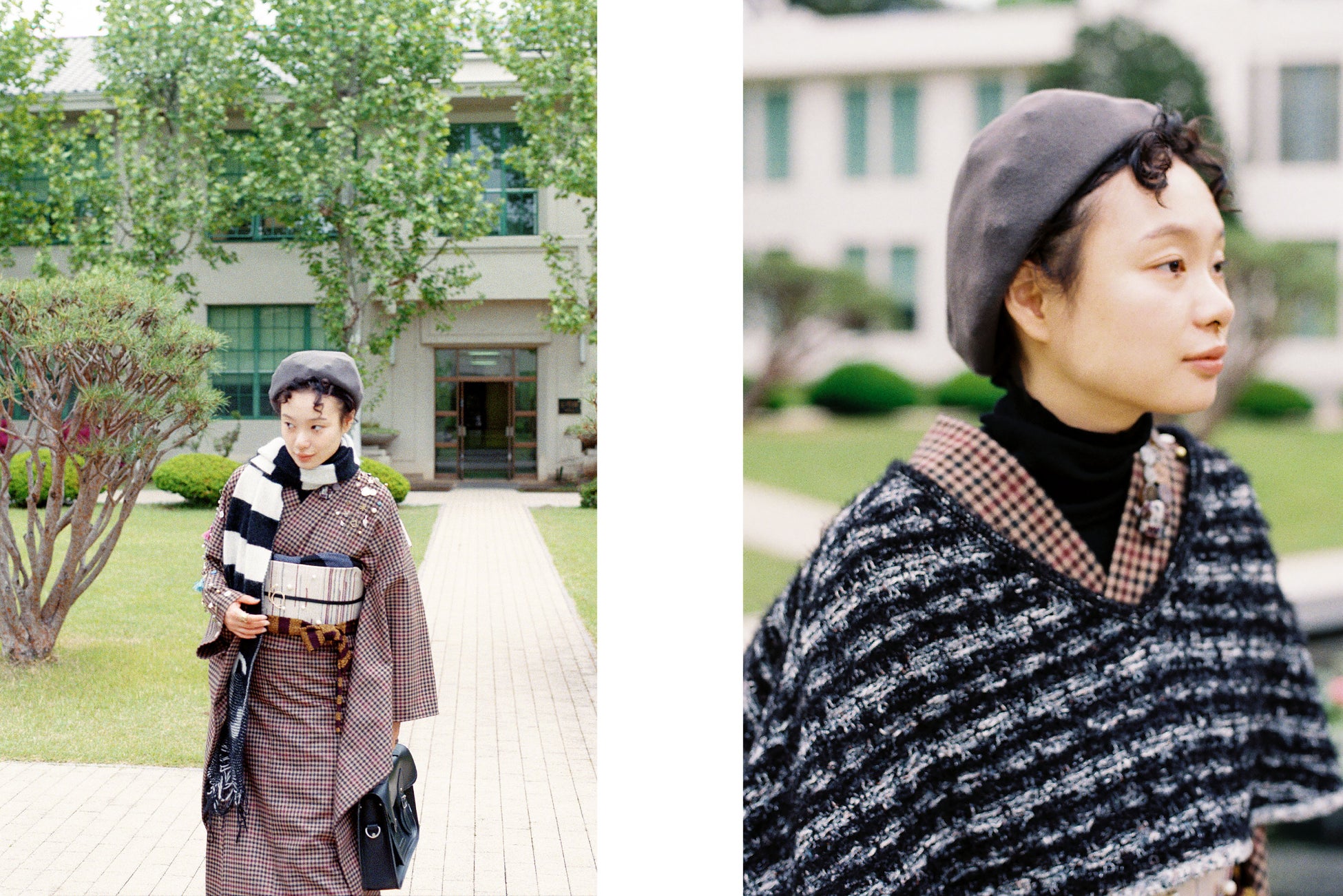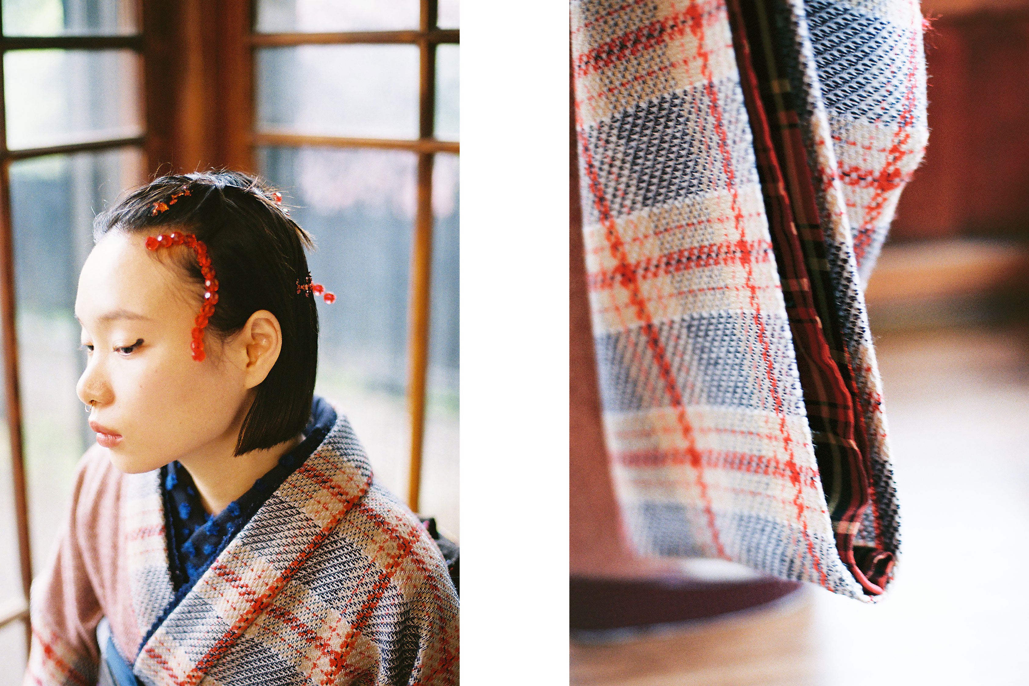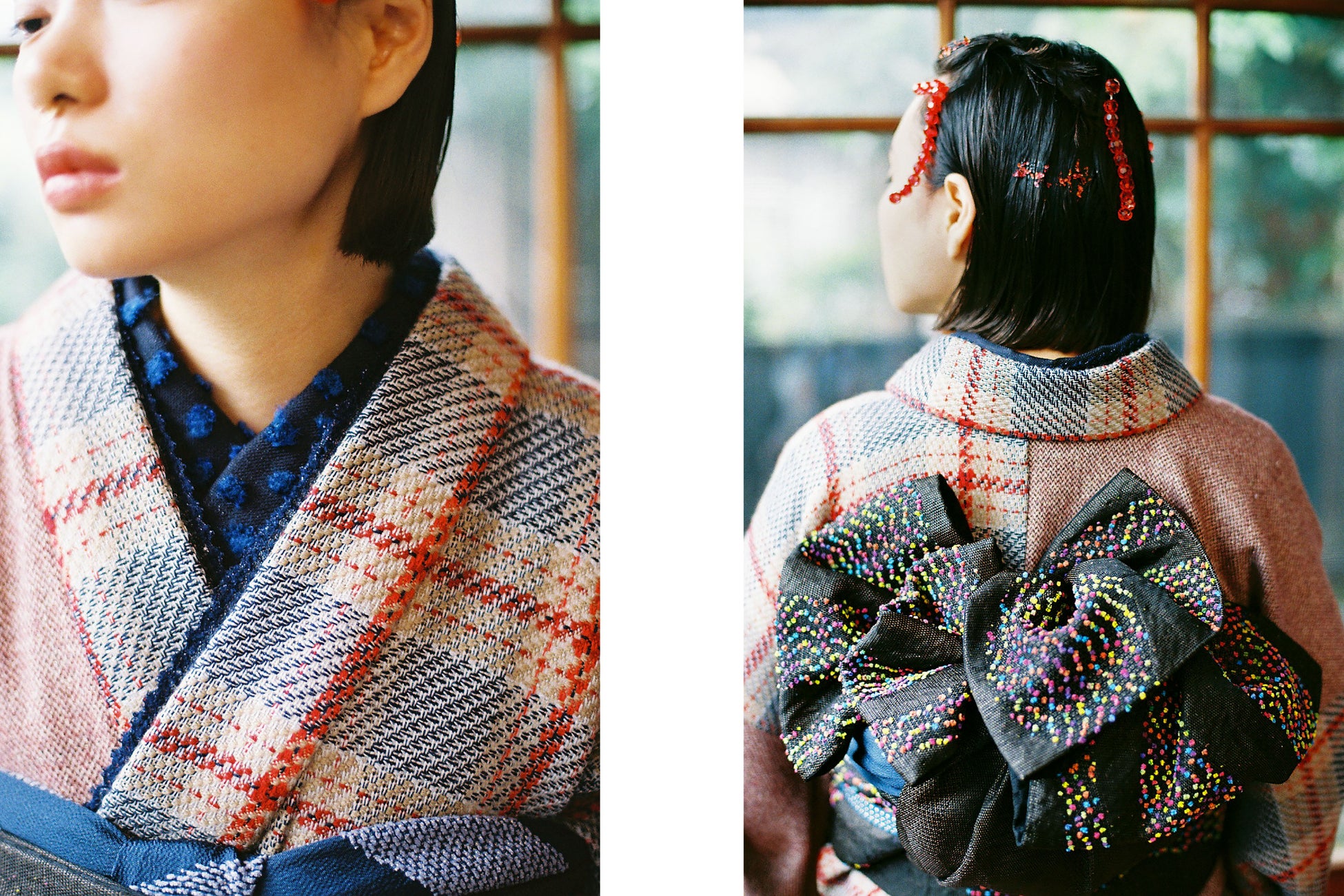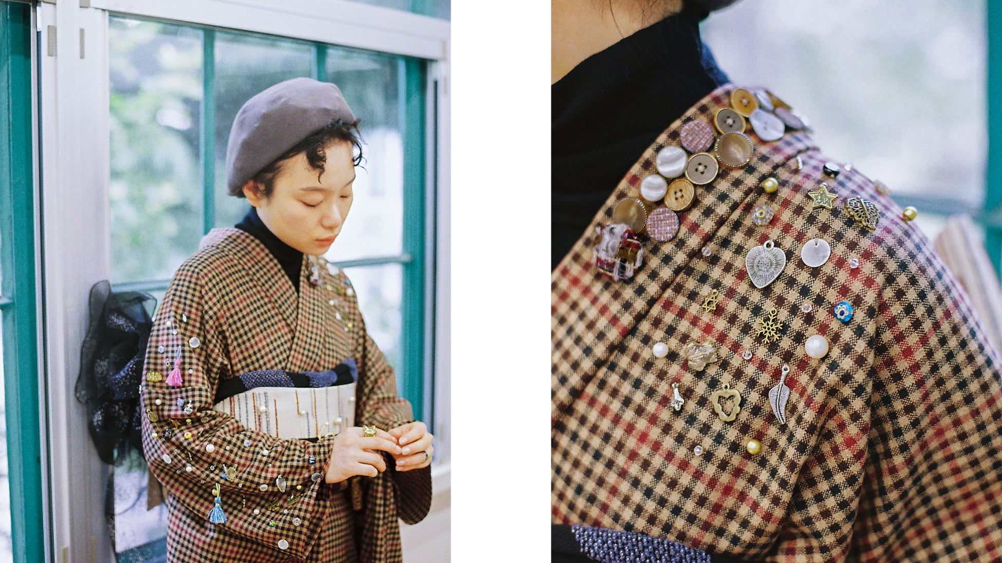 大胆なチェック柄は、無地のツイードと組み合わせることで、ポップで個性的なふりそでに。