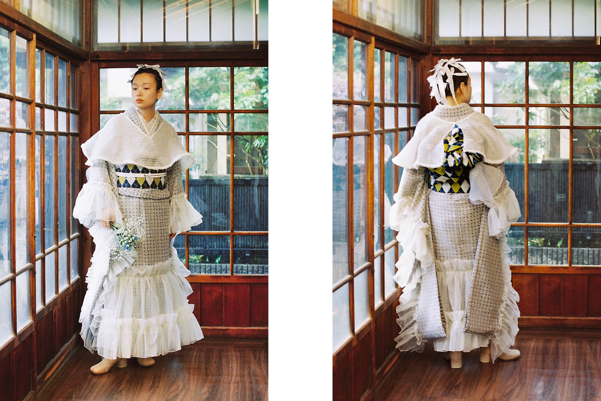 エールを贈る旗に見立てた、フラッグモール糸(旗のような不織布がついた糸)を織り込んだふりそでに、ベールを纏うようにレースを装飾しています。創業128年を迎え、世界のメゾンからも信頼される米沢織の織元の方と共に製作いたしました。