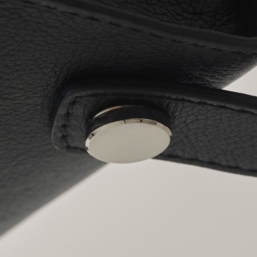 ブラックを着用したところ。金具が目立たないシンプルなデザインは、シックなブラックのレザーが際立ち、モードな印象を与えます。