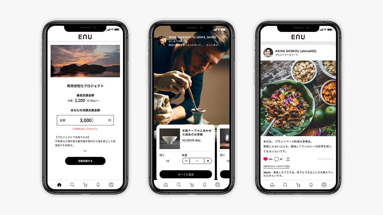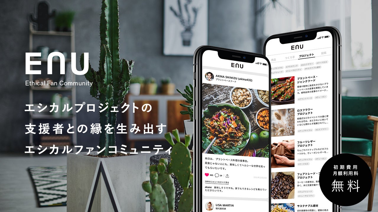 2021年に、伝統工芸作家・アーティストを支援するためのコミュニティとして発表したENUは、2023年1月、その領域を拡げ社会課題を解決したいプロジェクトオーナーがアイデアや思想、制作のプロセスを発信し、そのプロジェクトオーナーの「エシカルプロジェクト」と、プロジェクトを応援/支援したい「サポーター/フォロワー」が継続的につながるためのサービスとして生まれ変わりました。