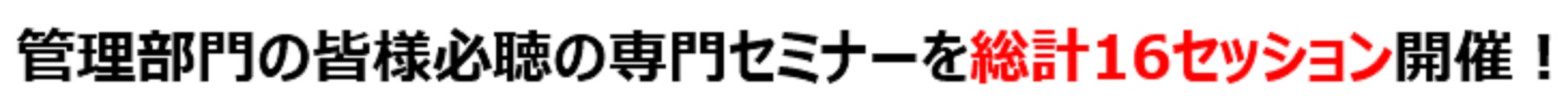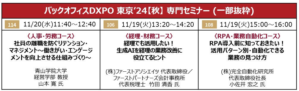 経理・財務コースでは、経理DXやChatGPT活用にも詳しい(株)ファーストアソシエイツ 代表取締役 竹田清香氏が、経理業務の業務改善・効率化に役立つ生成AIの活用方法を紹介、また人事・労務コースでは、働く人のキャリアと組織のマネジメントを専門とする青山学院大学 経営学部 教授 山本寛氏が、社員のエンゲージメントを高め離職を防ぐリテンション・マネジメントについて解説するなど、人事・総務・経理のプロはもちろん、DX・業務改革を推進する経営者必聴のセミナーが多数開催される。