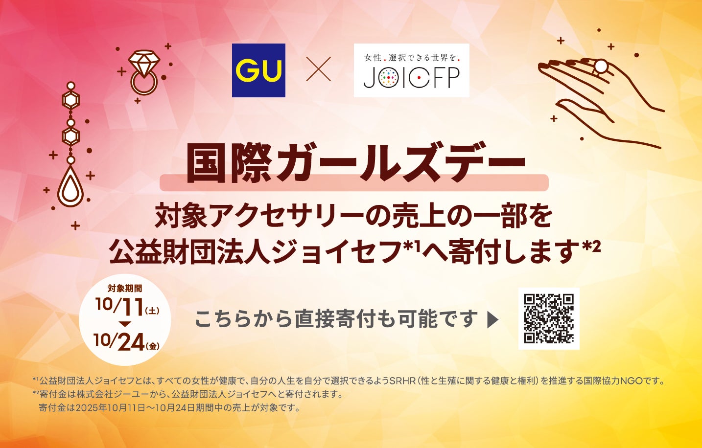 2025年10月11日(土)から10月24日(金)の期間で、ジーユーは対象アクセサリー(店舗とオンラインともに)の売上金の一部がジョイセフへ寄付されます。この寄付金は、とくに日本の若者が、性別問わず、心身ともに健康で自分らしい生き方を選べるよう、SRHR(性と生殖に関する健康と権利)を学ぶ機会の提供に使用されます。