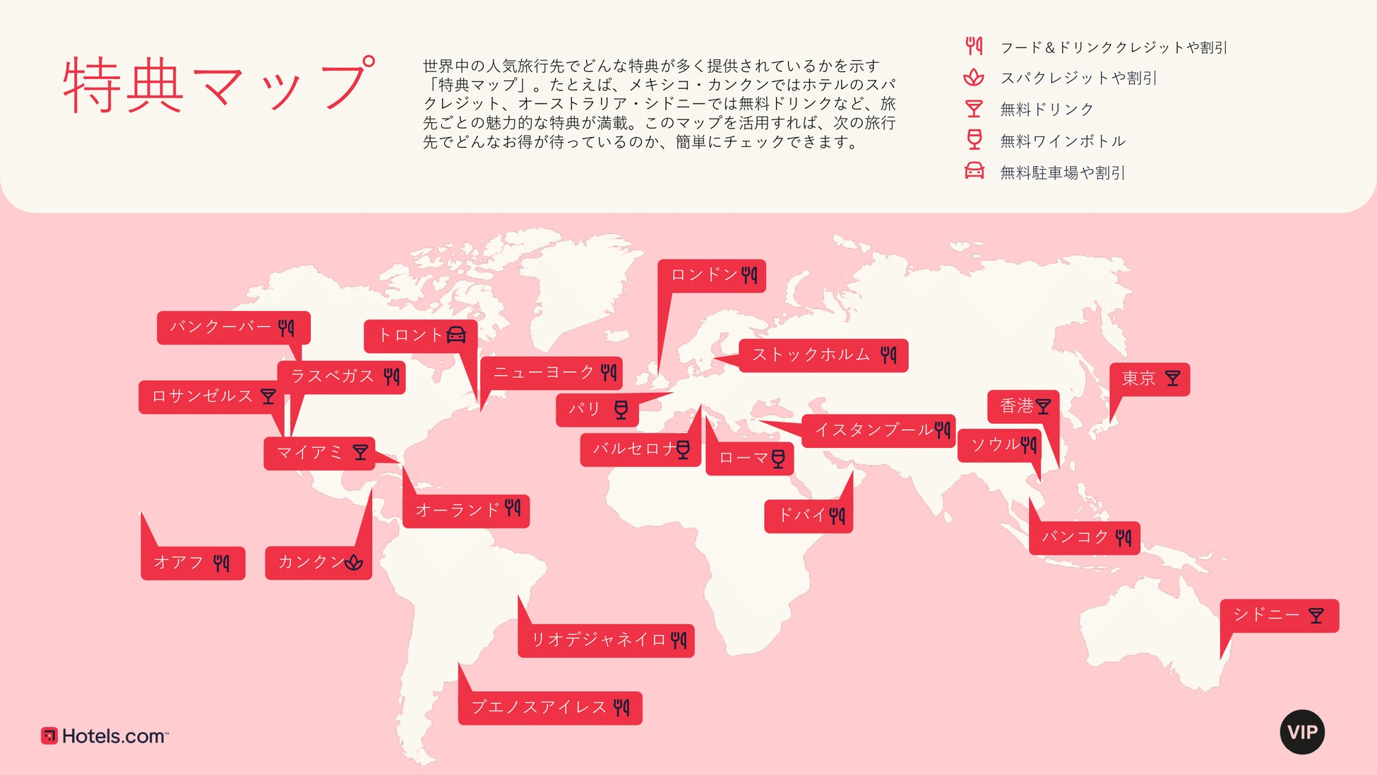 Hotels.comは、旅行では費用やホテルの星の数だけでなく、「体験」も重要だと考えています。Hotels.comのVIP Access提携施設に宿泊する会員は、さまざまな限定特典や割引などの特別な「体験」を楽しむことができます。