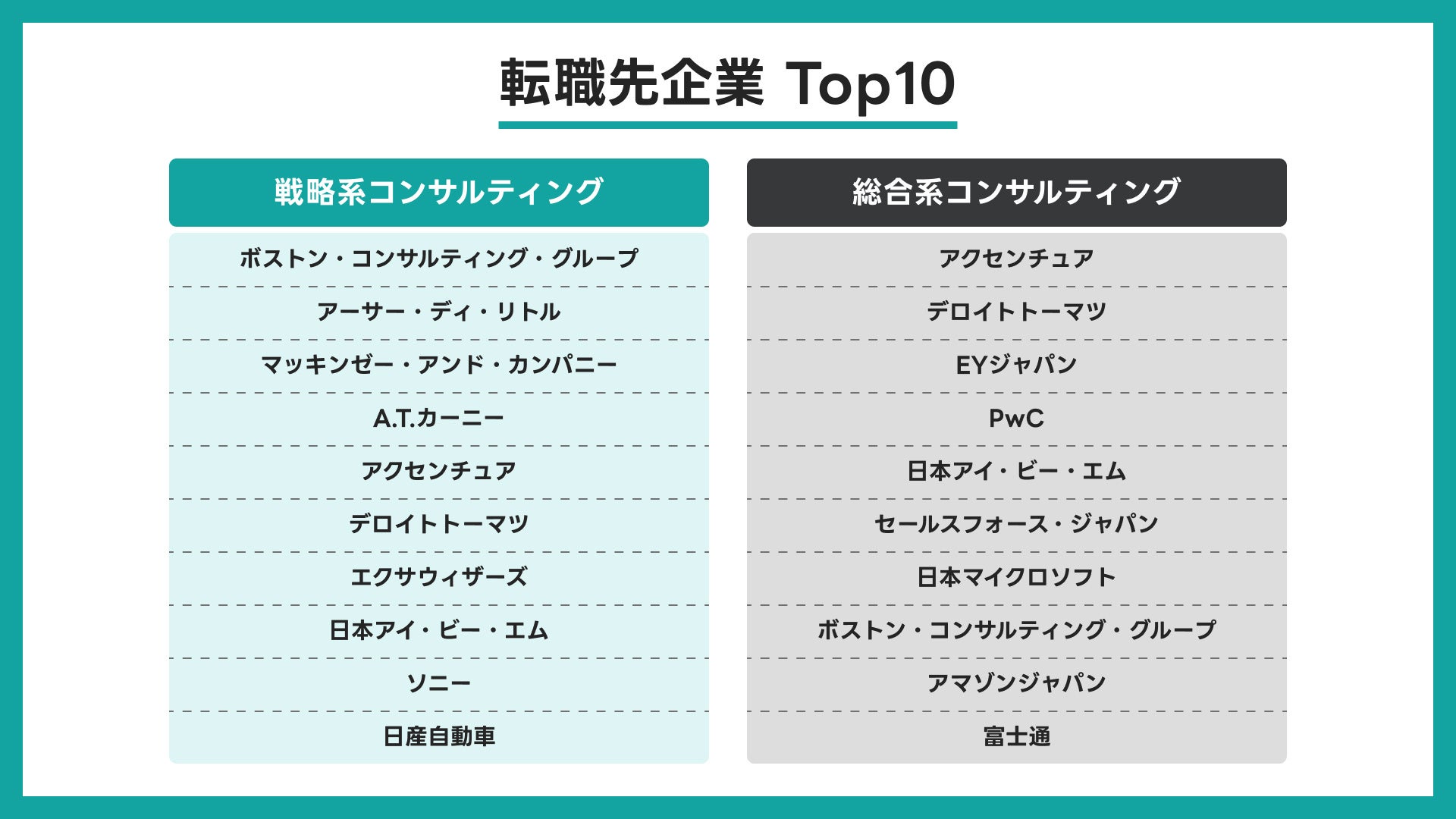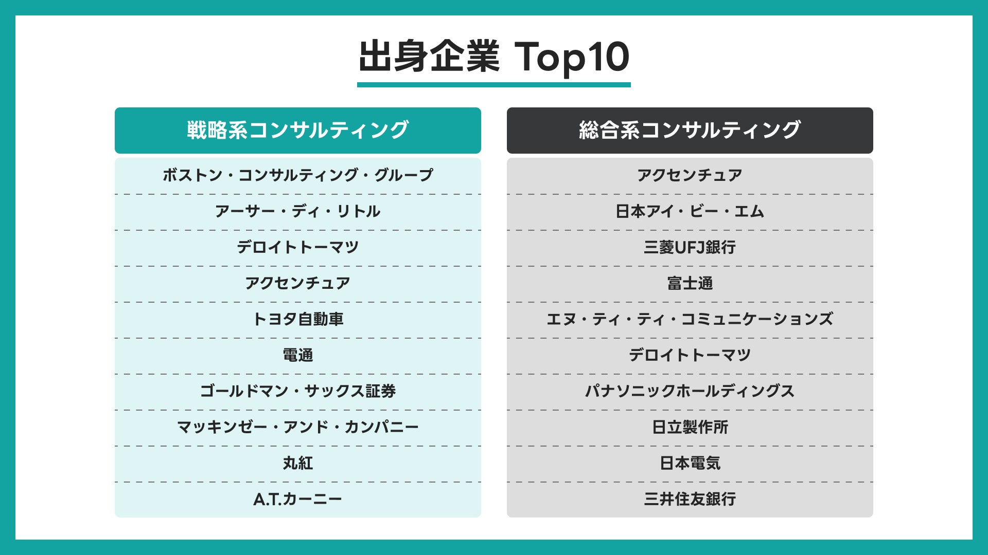戦略系は同業他社や人気業界のリーディングカンパニー(トヨタ自動車、電通や丸紅等)、総合系は日系のIT系(富士通、エヌ・ティ・ティ・コミュニケーションズや日立製作所等)や各業界のリーディングカンパニー(三菱UFJ銀行やパナソニックホールディングス等)と、採用実績としては有名企業出身者が大きな割合を占める結果となっている
