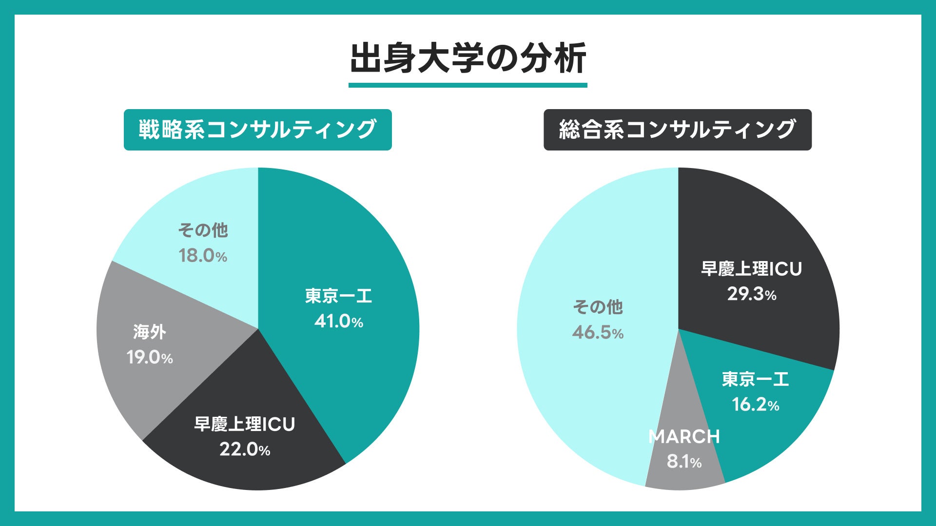 学歴では戦略系の出身大学は半数近くが東京大学、京都大学、一橋大学、東京科学大学(旧・東京工業大学)(以下、東京一工)もしくは海外(主にMBA)であるのに対し、総合系の出身大学は早稲田大学、慶應大学、上智大学、東京理科大学、国際基督大学(以下、早慶上理ICU)が約3割、明治大学、青山学院大学、立教大学、中央大学、法政大学(以下、MARCH)が約1割を占め、裾野が広がっている
