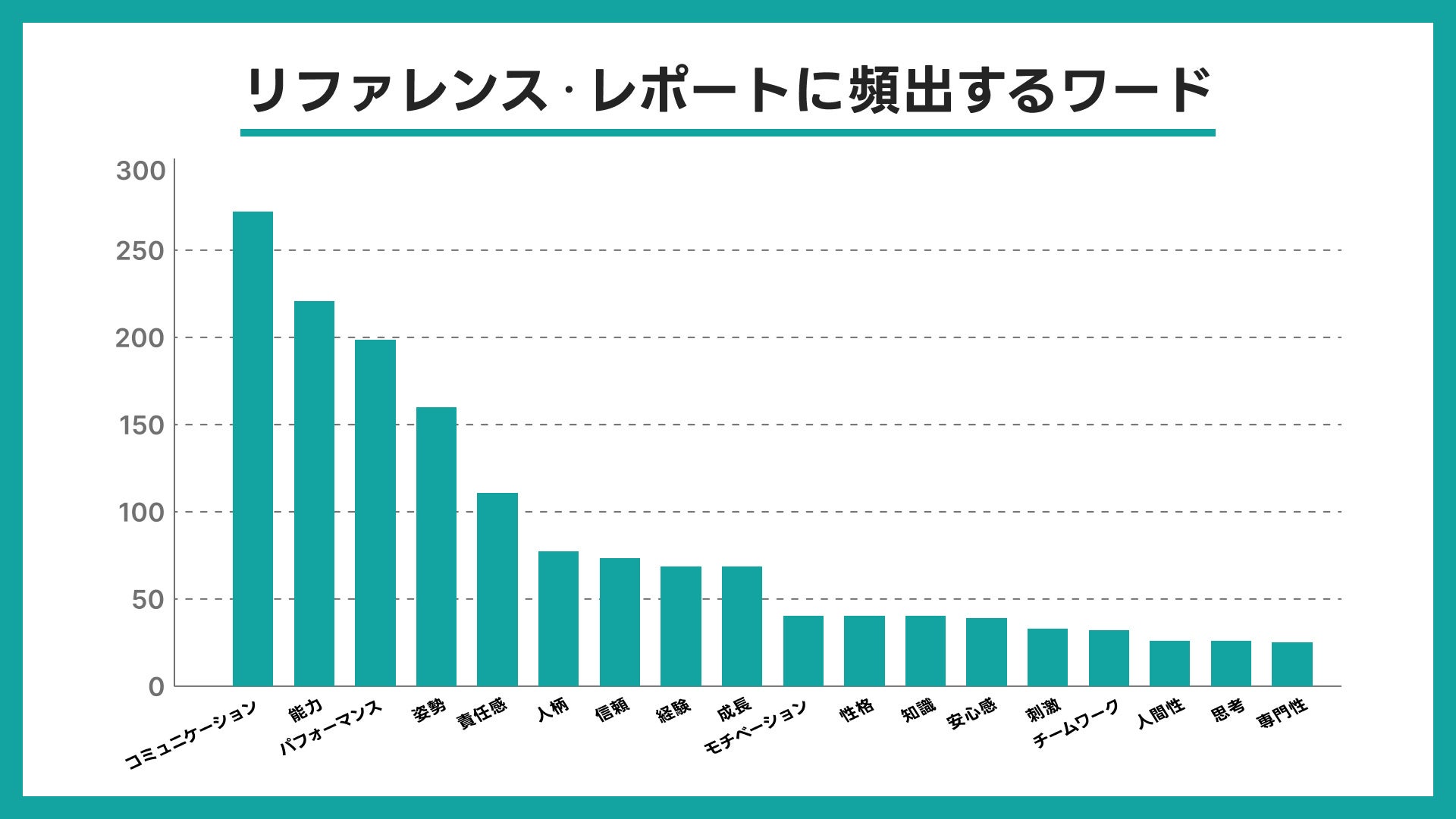 ・調査方法:推薦者(リファレンスを受ける依頼者の上司・同僚など)に「もう一度、依頼者と一緒に働きたい(雇いたい)と思いますか?また、その理由も教えてください。」の自由記述回答の内容を抽出