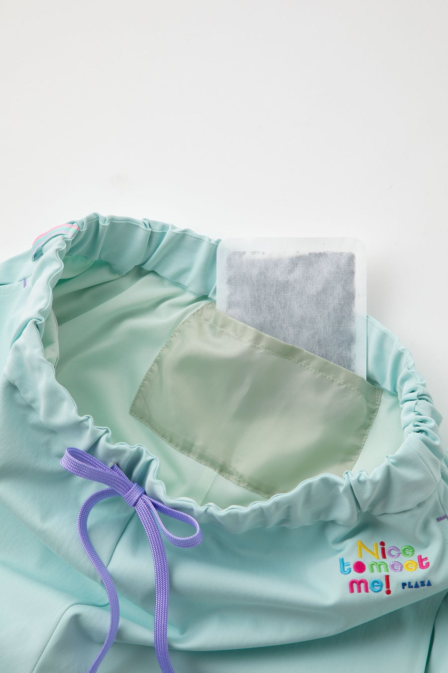 パンツもトップス同様、程よいリラックス感のあるユニセックスデザイン。生理の日にも安心して着用いただけるよう、横漏れを防ぐ裏地仕様。腰元の内側と腰元横の内側には、それぞれナプキンやカイロを収納できる便利なポケットを備えています。カラーに合わせた裏地やステッチ、ウエスト紐、動きやすさをサポートする裾スリットもポイント。さらに、オリジナルカラーのループをあしらい、細部までこだわりを詰め込みました。