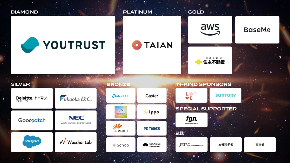 各プランに応じて、冠スポンサー名称掲出、ブース出展(16社限定)、ピッチコンテスト審査員登壇、プレイベント共催、参加者データ提供、採用・投資マッチング支援などのベネフィットをご提供いたします。