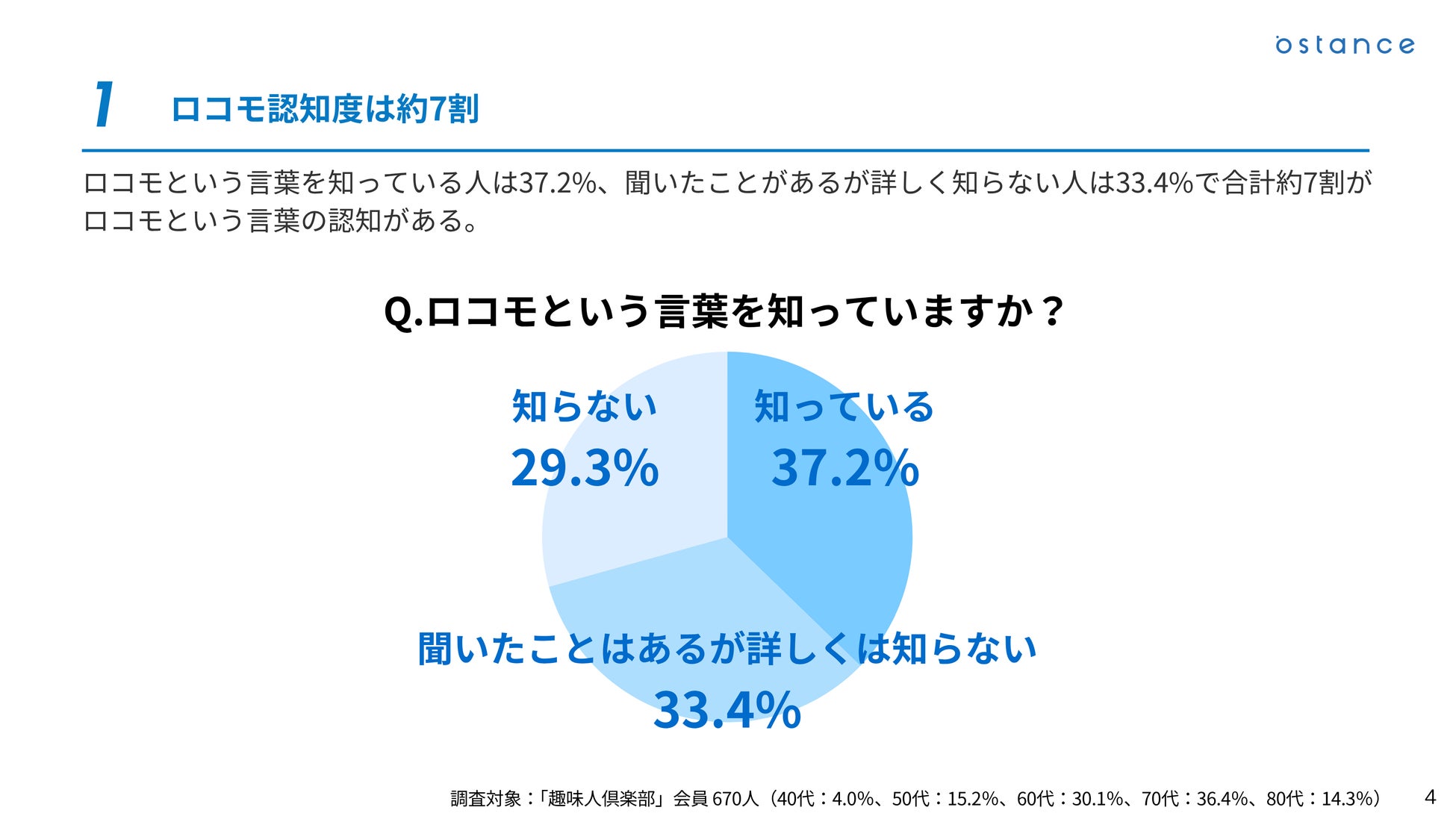 ・「ロコモ」という言葉の認知率は約7割(「知っている」37.2%、「聞いたことがある」33.4%)に達する一方、内容理解や対策実施まで至っている層は限定的。表面的な認知にとどまり、実行につながっていない可能性が高い。