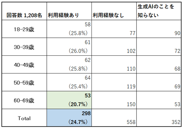 キャリインデックスでは、全国の1,208人(※)に、生成AIの利用経験と利用したサービスについて調査したところ、利用経験がある人は約4人に一人(24.7%)となりました。