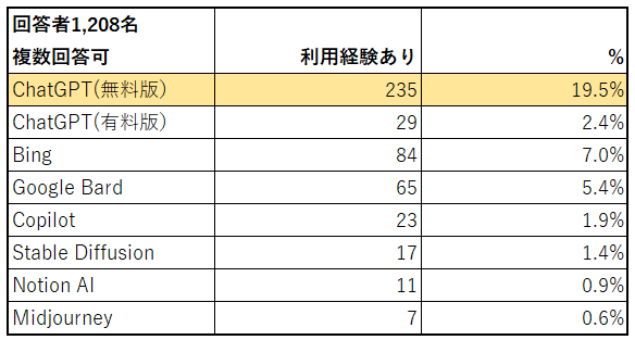 また、利用経験のある生成AIでは「ChatGPT(無料版)」が、19.5%と、他を大きく離す結果となりました。