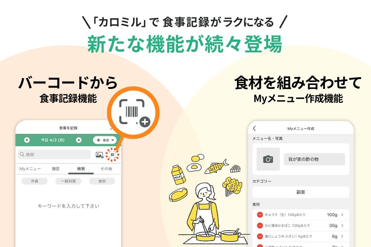 健康管理アプリ「カロミル」に「バーコード読み取り機能」と 「食材を組み合わせて My メニュー作成機能」を新たに追加