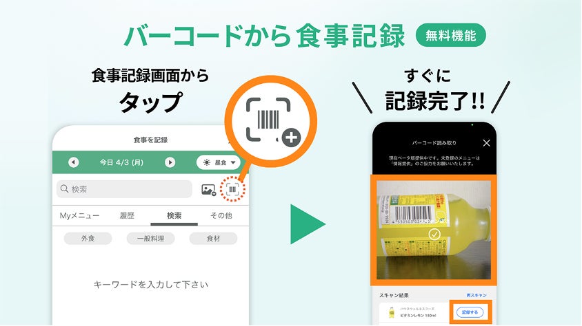 そこで、市販商品のバーコードを読み取るだけで簡単に記録ができる新機能の搭載を行い、3月にiOSで先行し