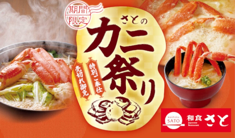 カニが大好きな方や、この冬まだカニを食べていない方、まだまだカニを食べたい方などなど、「カニ」料理を色々楽しめる「カニ祭り」は期間限定なので、是非この機会に和食さとで楽しい食事のひとときをお過ごしください。