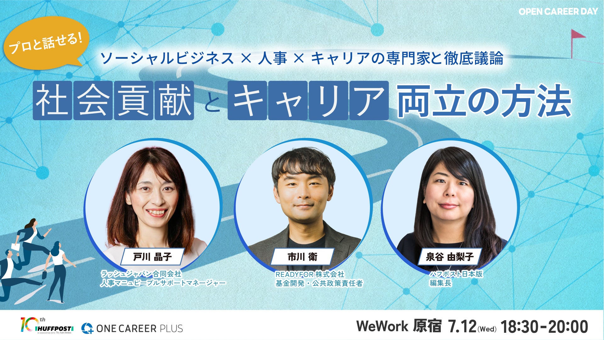 BuzzFeed Japan株式会社(本社 東京都渋谷区、以下、BuzzFeed Japan)が運営するメディア「ハフポスト日本版」は、10周年企画「未来を作る」イベント第4弾として、次のキャリアが見える、転職サイト「ONE CAREER PLUS」を運営するワンキャリアとコラボし、社会貢献をキャリアの軸にする方法を考えるイベント「プロと話せる!『社会貢献』と『キャリア』両立の方法 〜ソーシャルビジネス×人事×キャリアの専門家と徹底議論〜」を7月12日(水)に開催します。