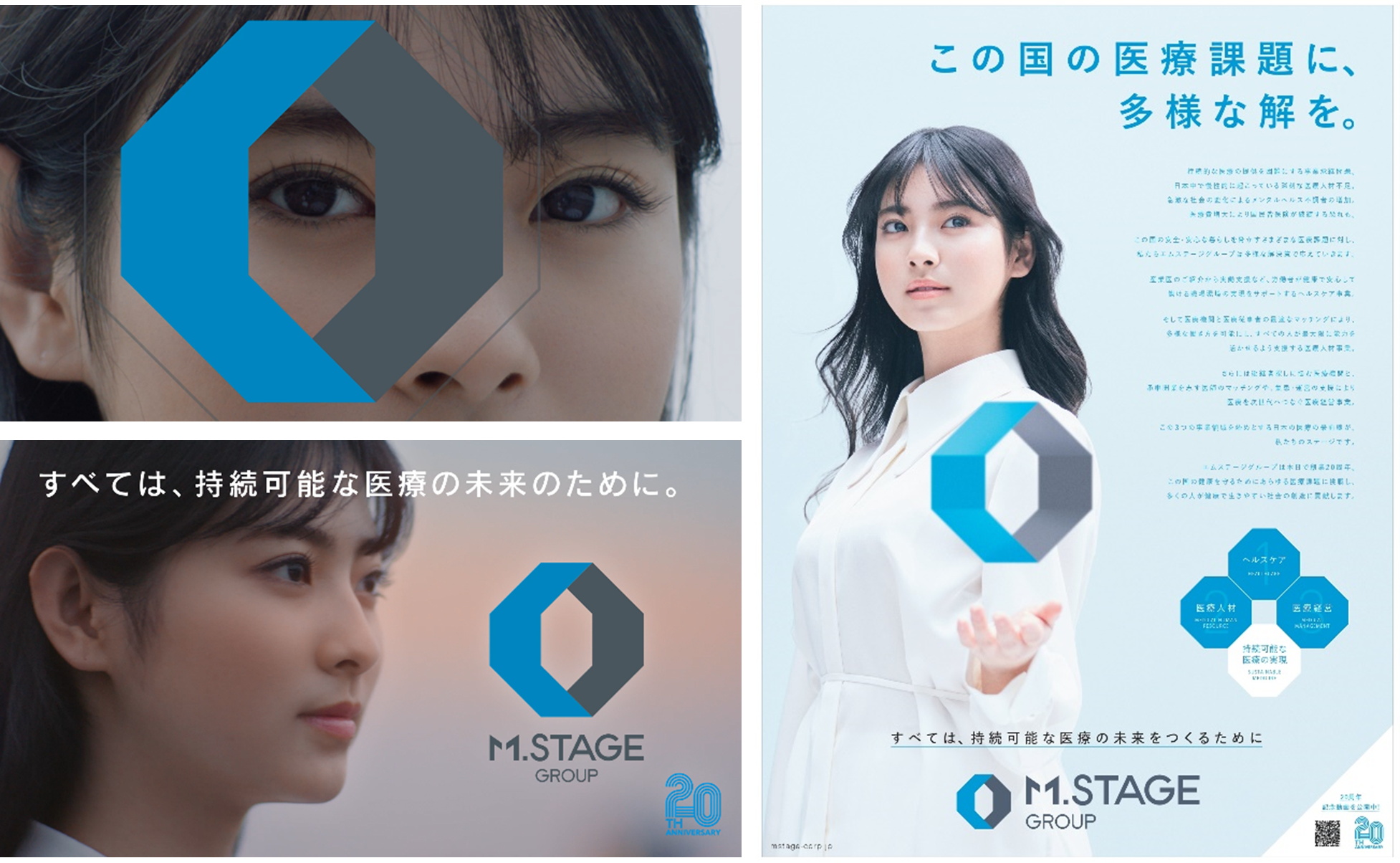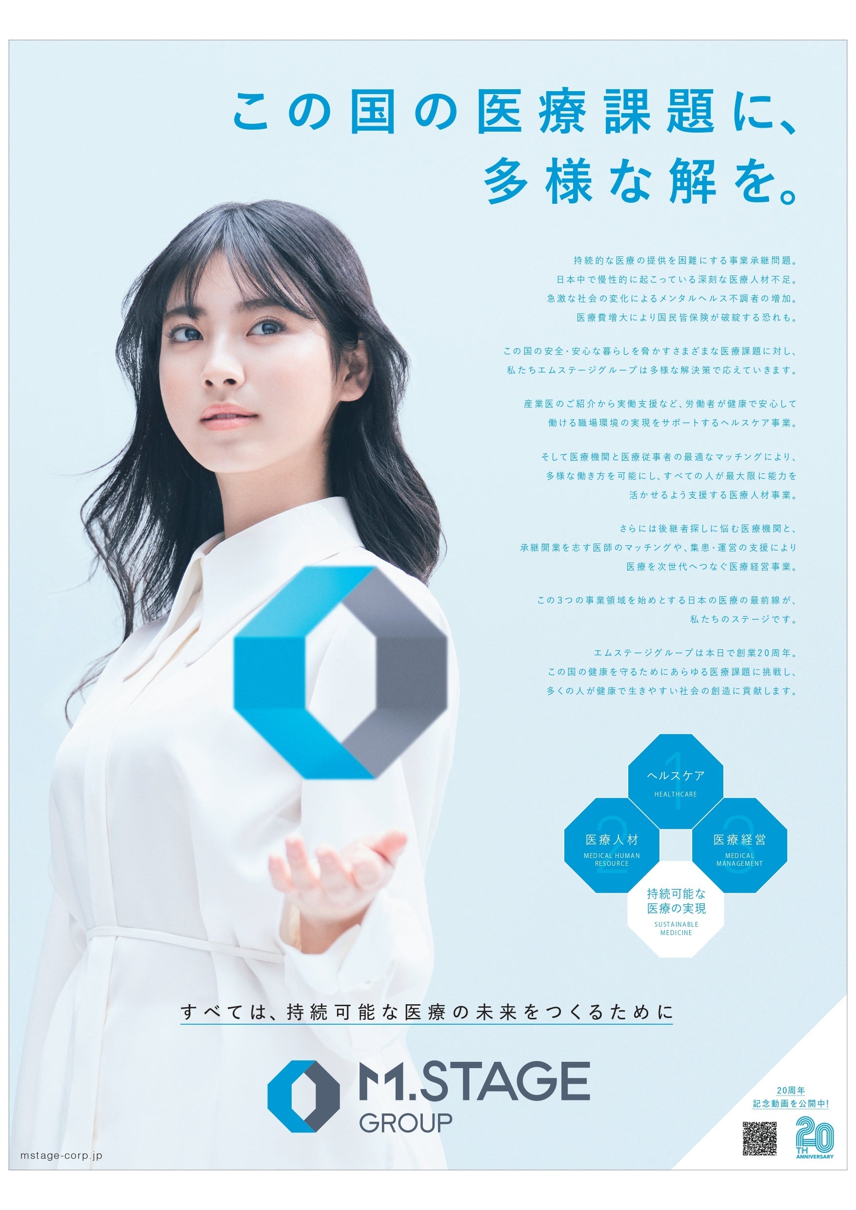 エムステージグループは、2003年5月9日の創業以来、「すべては、持続可能な医療の未来をつくるために」のビジョンのもと、ヘルスケア・医療人材・医療経営の3つの事業を中心に、日本の医療課題の解決に取り組んできました。そしてこの度、2023年5月9日をもって、エムステージグループは創業20周年になります。「この国の医療課題に、多様な解を」を新たにミッションに掲げ、これからも、多くの人が健康で生きやすい社会の創造に貢献します。今回制作したブランディングムービーと新聞広告は、エムステージグループのロゴをシンボルに、そんな事業にかける思いや、決意を表現しました。