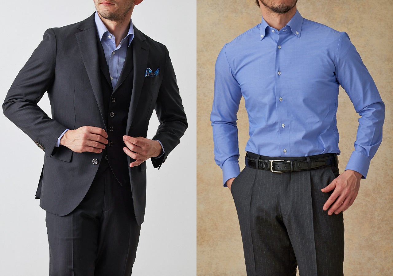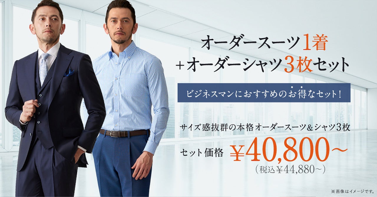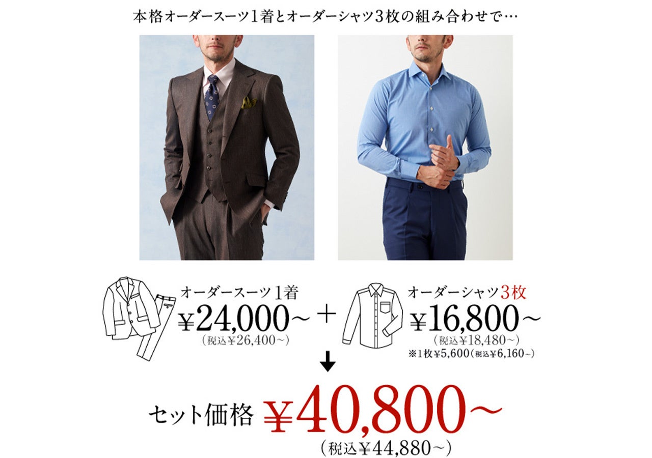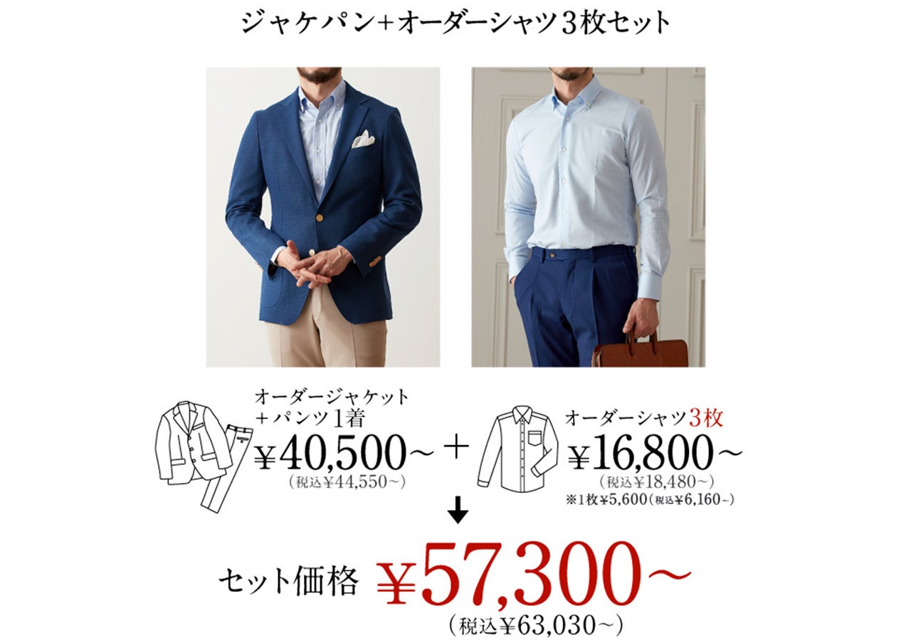 オーダースーツ&シャツ3枚セット価格40,800円~(税込44,880円~)/ジャケパンとシャツ3枚セット価格57,300円~(税込63,030円~)
