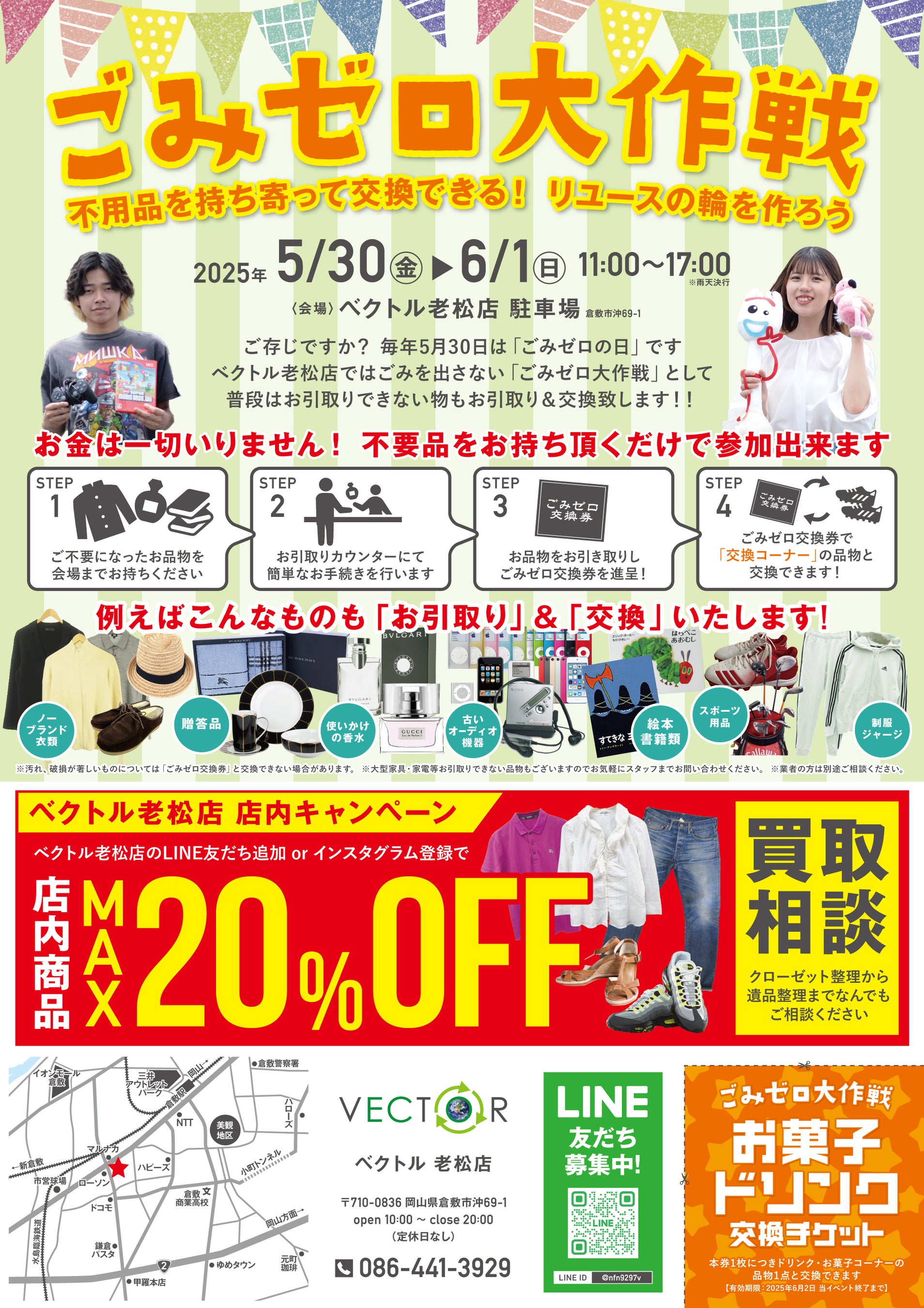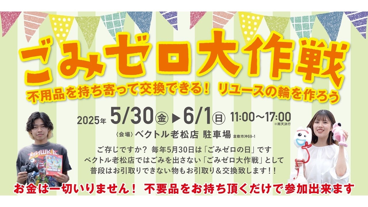 ファッションアイテムの買取や販売を⼿掛ける株式会社ベクトル(本社︓東京都港区、代表取締役︓村川智博)は、「ごみゼロの日」として制定されている2025年5月30日(金)から3日間に渡り、誰でも無料で参加できる物々交換イベント「ベクトルごみゼロ大作戦」を岡山県倉敷市で開催します。