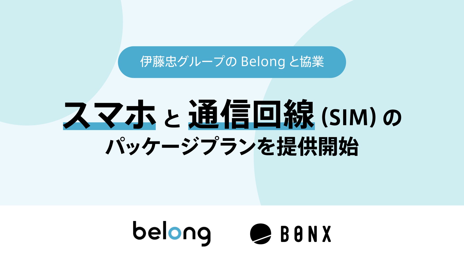 株式会社BONX(本社:東京都中央区、代表取締役:宮坂 貴大、以下「BONX」)は伊藤忠グループの株式会社Belong(本社:東京都港区、代表取締役社長 井上 大輔、以下「Belong」)と協業し、BONXが提供する「BONX WORK」をご利用いただくスマートフォンおよび通信回線(SIM)のパッケージプランの提供を開始しました。