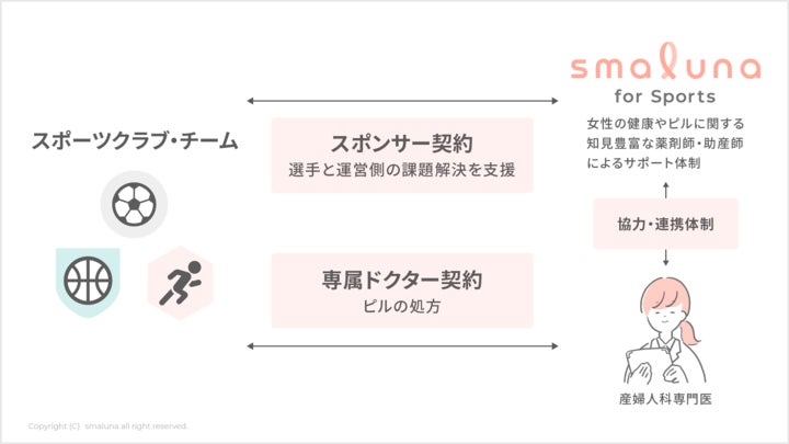 この度の取り組みでは、「ZOOS」所属選手と女性スタッフ向けに、スマルナ for Sportsの産婦人科医師が専属ドクターとして、オンライン診察やピルの処方サービスを提供し、一人ひとりのコンディションに合わせたご相談や悩みに寄り添いサポートします。さらに、スマルナに連携する助産師と薬剤師が365日オンライン医療相談を受け付けるなど、最適なタイミングで医療へ、そして婦人科へアクセスいただける環境を整えることで、予防医療の領域から健康課題に対し総合的にサポートします。
