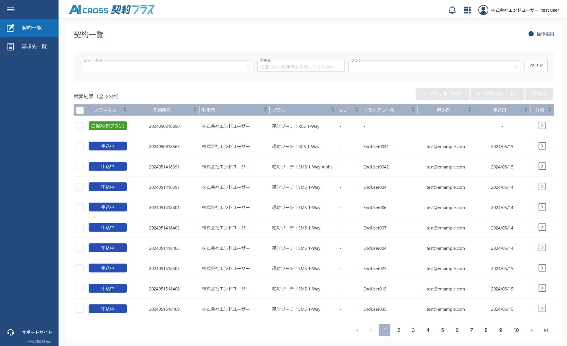「契約プラス」は、従来は書面(電子ファイル)での利用申し込みをWEB上で受付ができるサービスです。利用申し込みの受付業務をペーパレス化することにより、社内の営業やバックオフィスとのやりとりも自動フロー化して業務効率化を実現するサービスです。また、社内向けには請求書作成処理の自動化も実現しています。