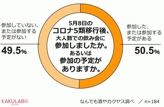 アンケートを実施したのは、5類移行から約1カ月後だったことを考えると、大人数での飲み会に参加することを様子見した人や、そうした飲み会自体がまだ数少なかったとも考えられます。5類移行が定着した現在では、参加者の割合が増えている可能性があります。
