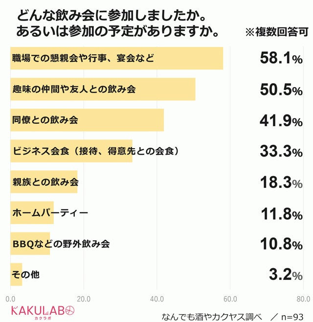 では、「参加した、または参加する予定がある」と回答した人に、どんな飲み会に参加したかを複数回答可で聞いてみたところ、第1位は「職場での懇親会や行事、宴会など」で58%に達しました。第2位は「趣味の仲間や友人との飲み会」(51%)、第3位は「同僚との飲み会」(42%)でした。