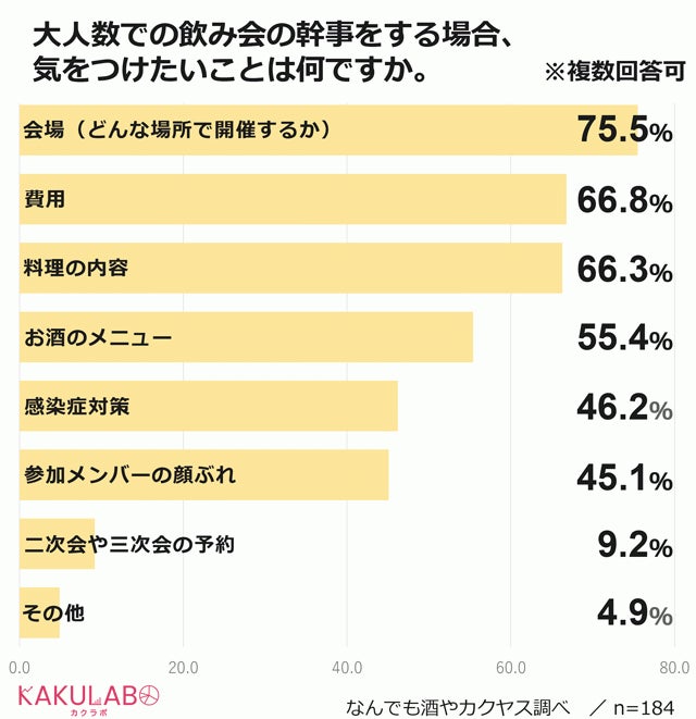 まず、気をつけたいことを複数回答可で聞いてみたところ、最も多かったのは「会場」(76%)で、次いで「費用」(67%)、「料理の内容」(66%)、「お酒のメニュー」(55%)と続きます。