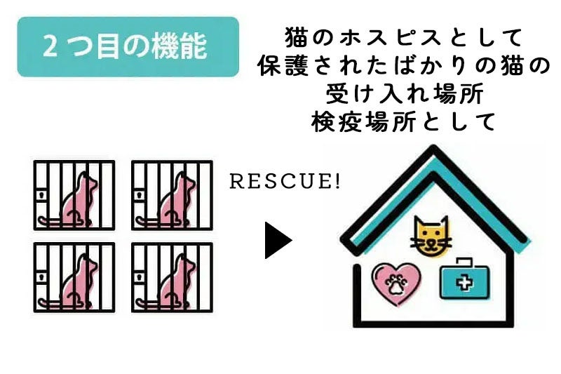 このシェルターは、猫たちを救う拠点として、そして、より多くの方々が猫助けにかかわれるきっかけとなる拠点にしていきたいと考えています。
