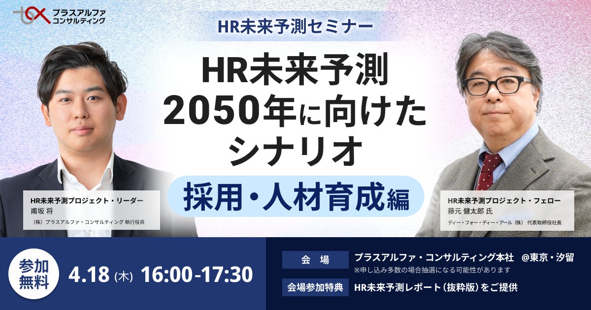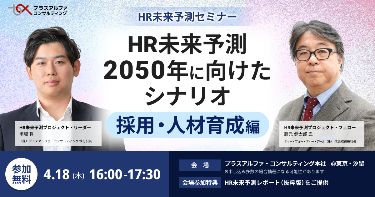 2024年4月18日(木)に、『HR未来予測「2050年に向けたシナリオ」(採用・人材育成編)』 をテーマとした第1回セミナーを開催します。