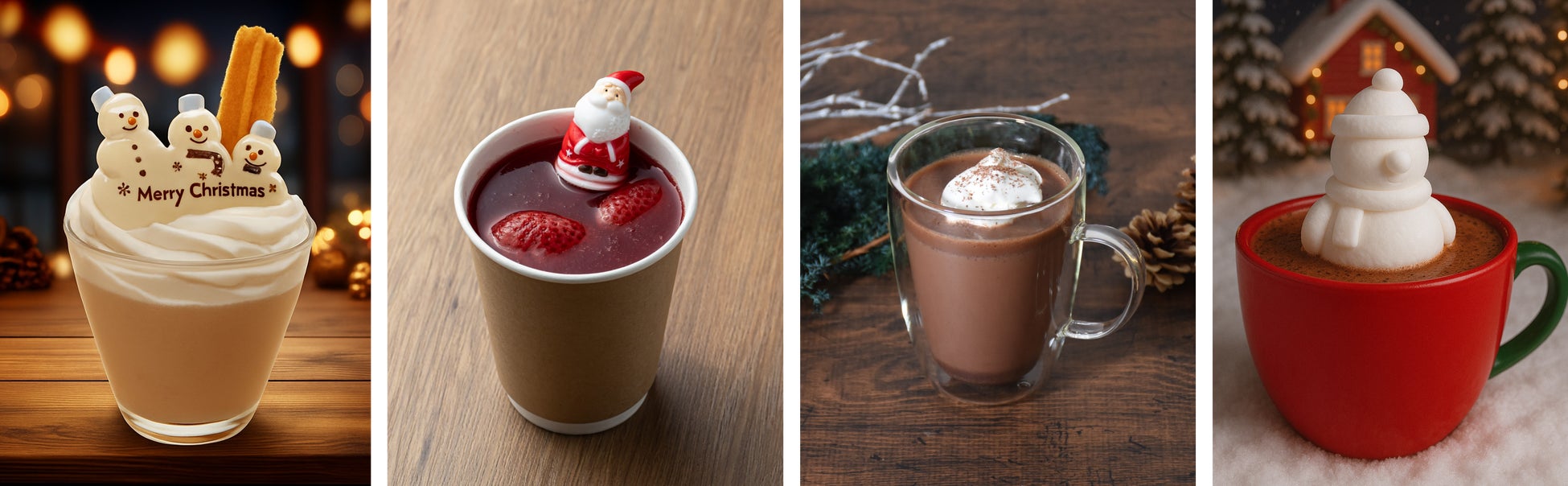 ふわふわの生クリームでかたどったサンタクロースや雪だるまが、あたたかいココアのお風呂に浸かっているような見た目は、思わず写真を撮りたくなる愛らしさ!濃厚なココアのコクと、とろける生クリームのやさしい甘さが広がる冬限定の特別なメニュー。