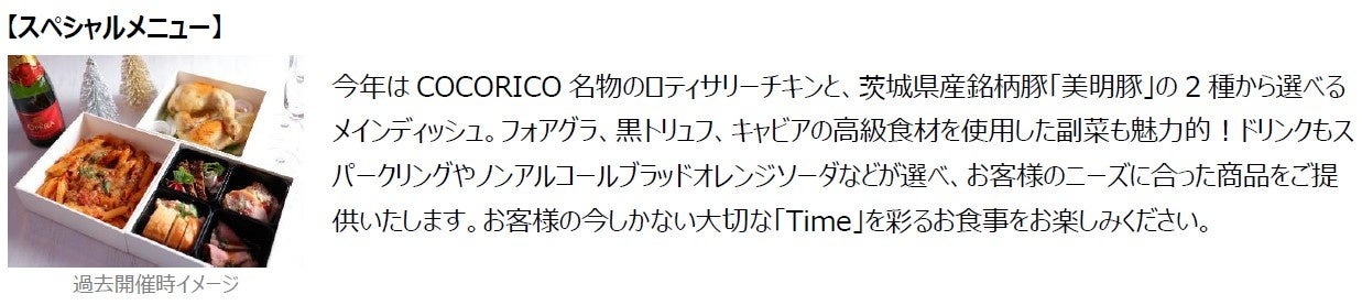 お食事は、横浜赤レンガ倉庫館内の人気イタリアンレストラン「Café & Rotisserie LA COCORICO」によるクリスマス限定のスペシャルメニューをご用意。今年のコンセプト「Time」をテーマに、高級食材を使用したメニューも登場予定です。五感を刺激する、映画のワンシーンのようなクリスマス体験をご提供します。