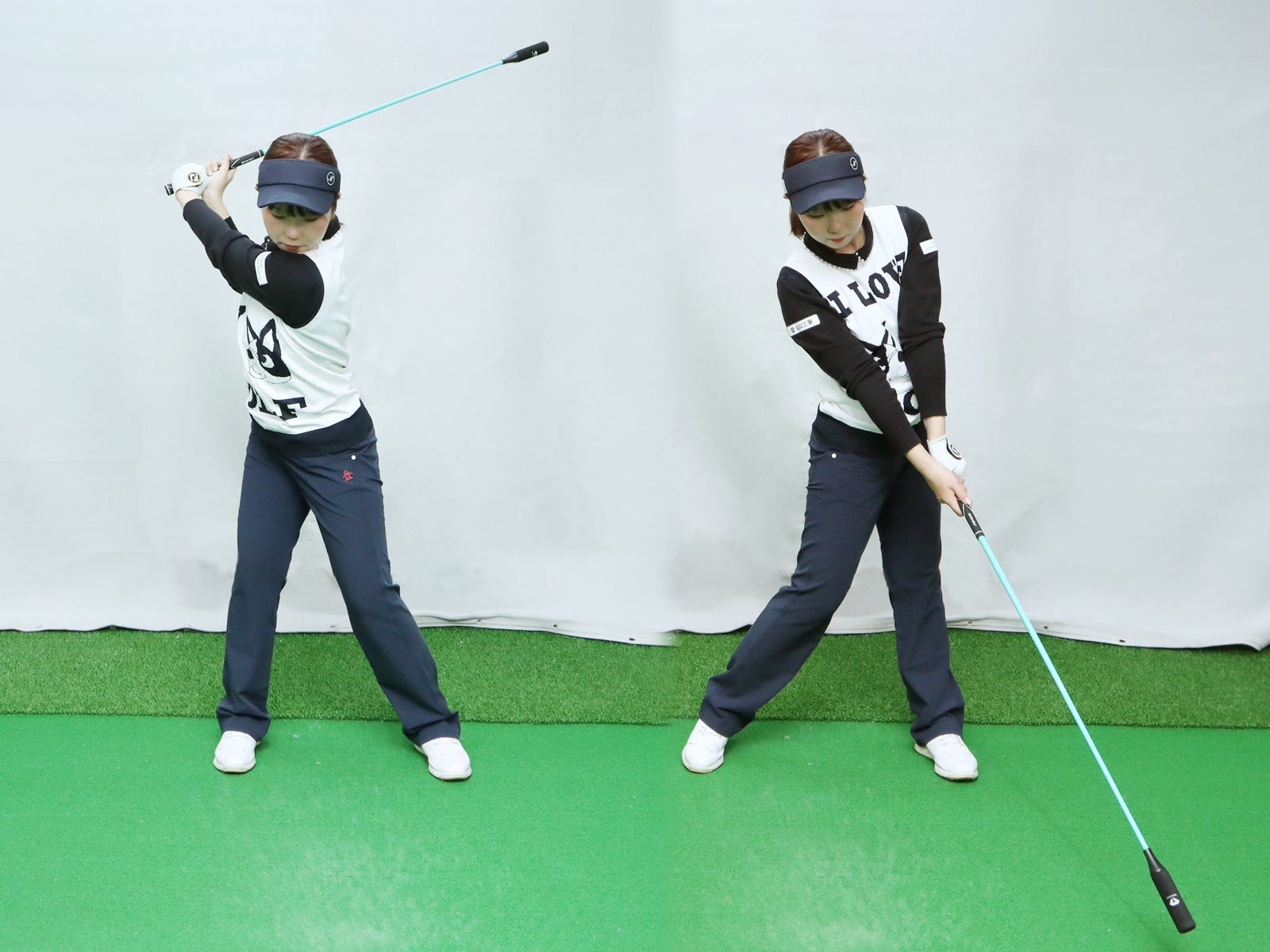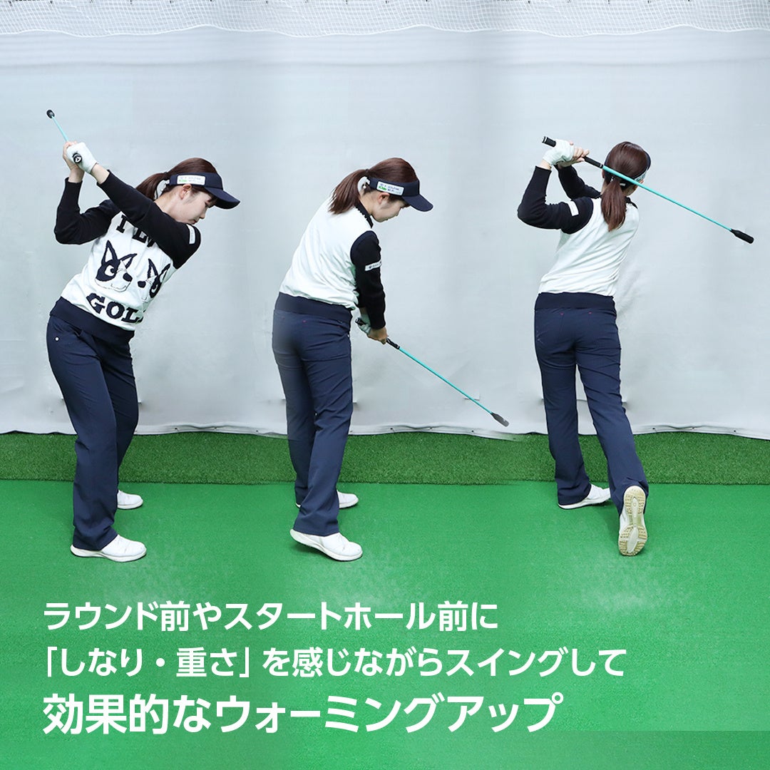 ラウンド前の練習場やスタートホールのティーオフ前にしなりと重さを感じながら、15回~20回とスイングしながら体をほぐすことで、肩や腰の可動域を拡大してスムーズにスイングしやすくなります。また、最加速点でヘッド部から「カチッ」という音が鳴るので、インパクトゾーン付近で音が鳴るようにスイングリズムを整えれば、ヘッドスピード向上とタメを意識したスイングが身に付きます。