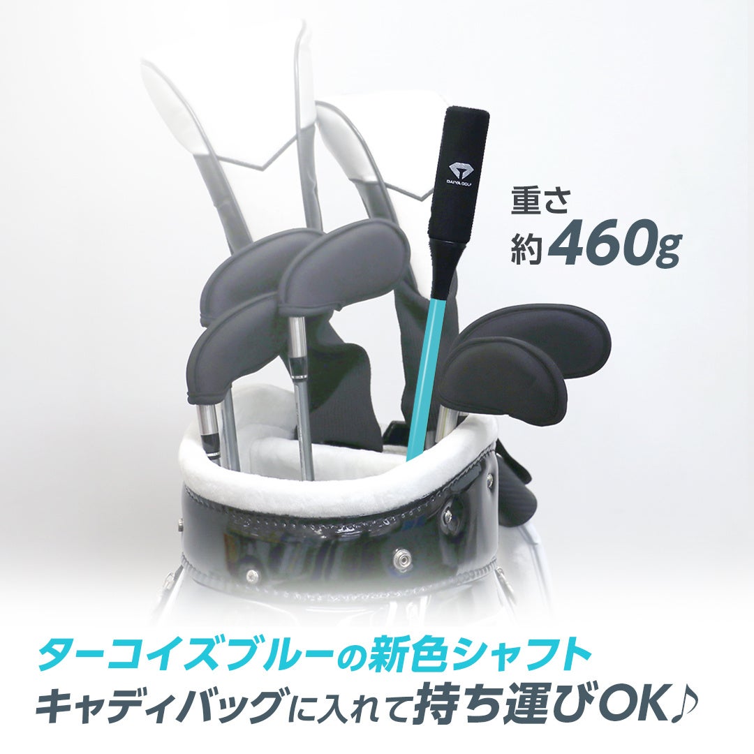 おしゃれなターコイズブルーの新色シャフトは男女問わず使いやすいだけでなく、残像効果のある色なのでスイングプレーンの確認もできます。キャディバッグに1本入れておくことで、ラウンド前の練習でのウォーミングアップやストレッチ、突如スイングリズムが崩れたときに『ダイヤスイングプロツアー』を振りなおすことで気持ちの焦りからくる早打ちも防げます。