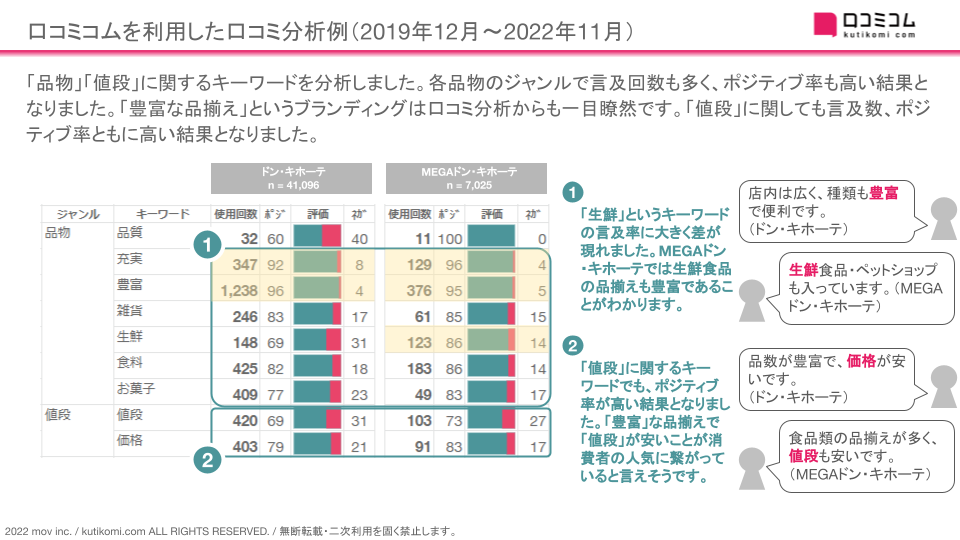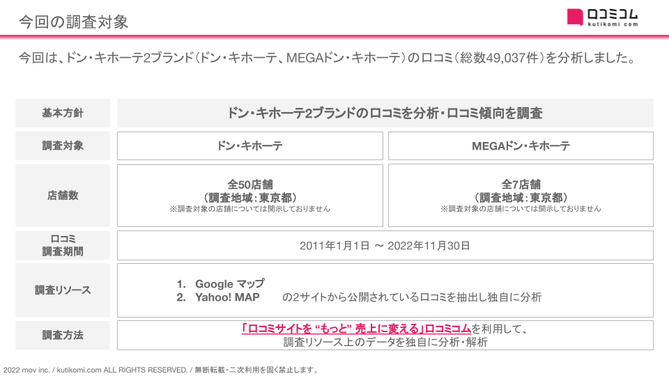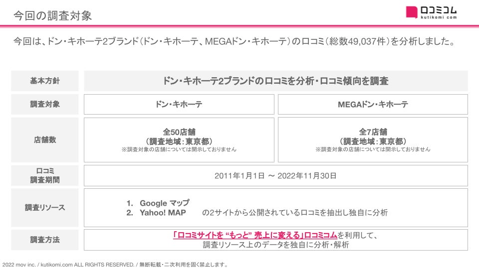 今回は、ドン・キホーテ2ブランド(ドン・キホーテ、MEGAドン・キホーテ)の口コミ(総数49,037件)を分析しました。