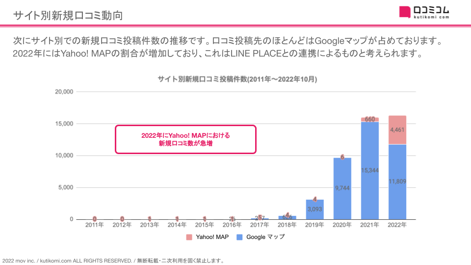 次にサイト別での新規口コミ投稿件数の推移です。口コミ投稿先のほとんどはGoogleマップが占めております。2022年にはYahoo! MAPの割合が増加しており、これはLINE PLACEとの連携によるものと考えられます。
