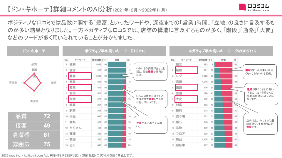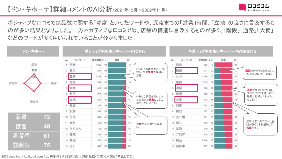 ポジティブな口コミでは品数に関する「豊富」といったワードや、深夜までの「営業」時間、「立地」の良さに言及するものが多い結果となりました。一方ネガティブな口コミでは、店舗の構造に言及するものが多く、「階段」「通路」「大変」などのワードが多く用いられていることが分かりました。