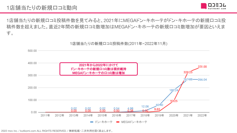 1店舗当たりの新規口コミ投稿件数を見てみると、2021年にMEGAドン・キホーテがドン・キホーテの新規口コミ投稿件数を超えました。直近2年間の新規口コミ数増加はMEGAドン・キホーテの新規口コミ数増加が要因といえます。