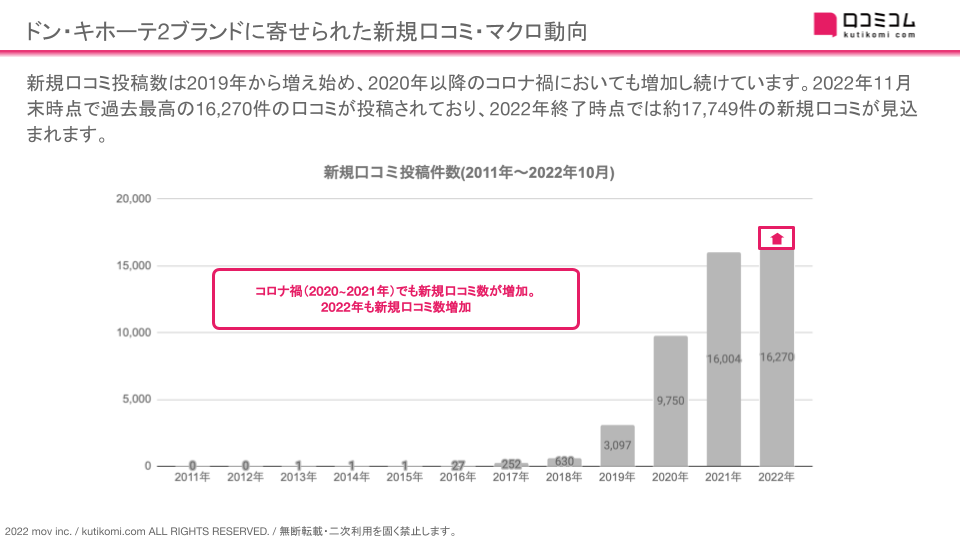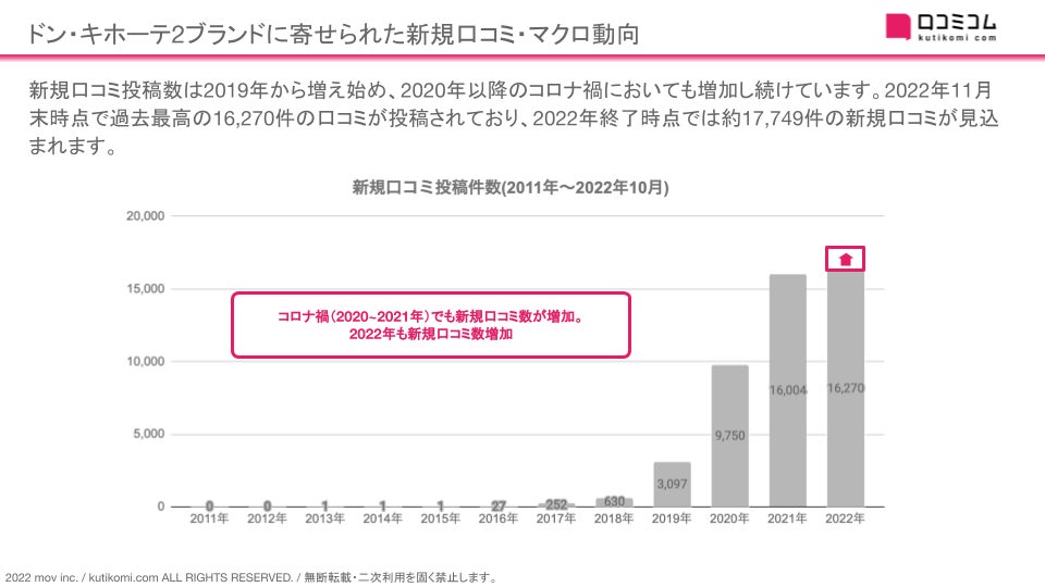 新規口コミ投稿数は2019年から増え始め、2020年以降のコロナ禍においても増加し続けています。2022年11月末時点で過去最高の16,270件の口コミが投稿されており、2022年終了時点では約17,749件の新規口コミが見込まれます。