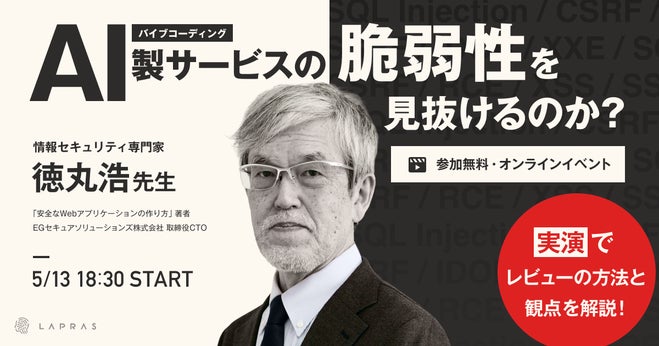 LAPRAS株式会社(所在地:東京都渋谷区、代表取締役:染谷健太郎 以下、LAPRAS)は、2026年5月13日(水)に、Webアプリケーションセキュリティの第一人者である徳丸 浩氏をゲストに迎え、オンラインイベント「徳丸先生はバイブコーディング製サービスの脆弱性を見抜けるのか」を無料開催いたします。本イベントでは、徳丸氏に完全バイブコーディング(AI生成)で構築されたサービスのセキュリティチェックを実演・解説していただくことで、AI時代における安全なサービス開発のあり方を学べます。