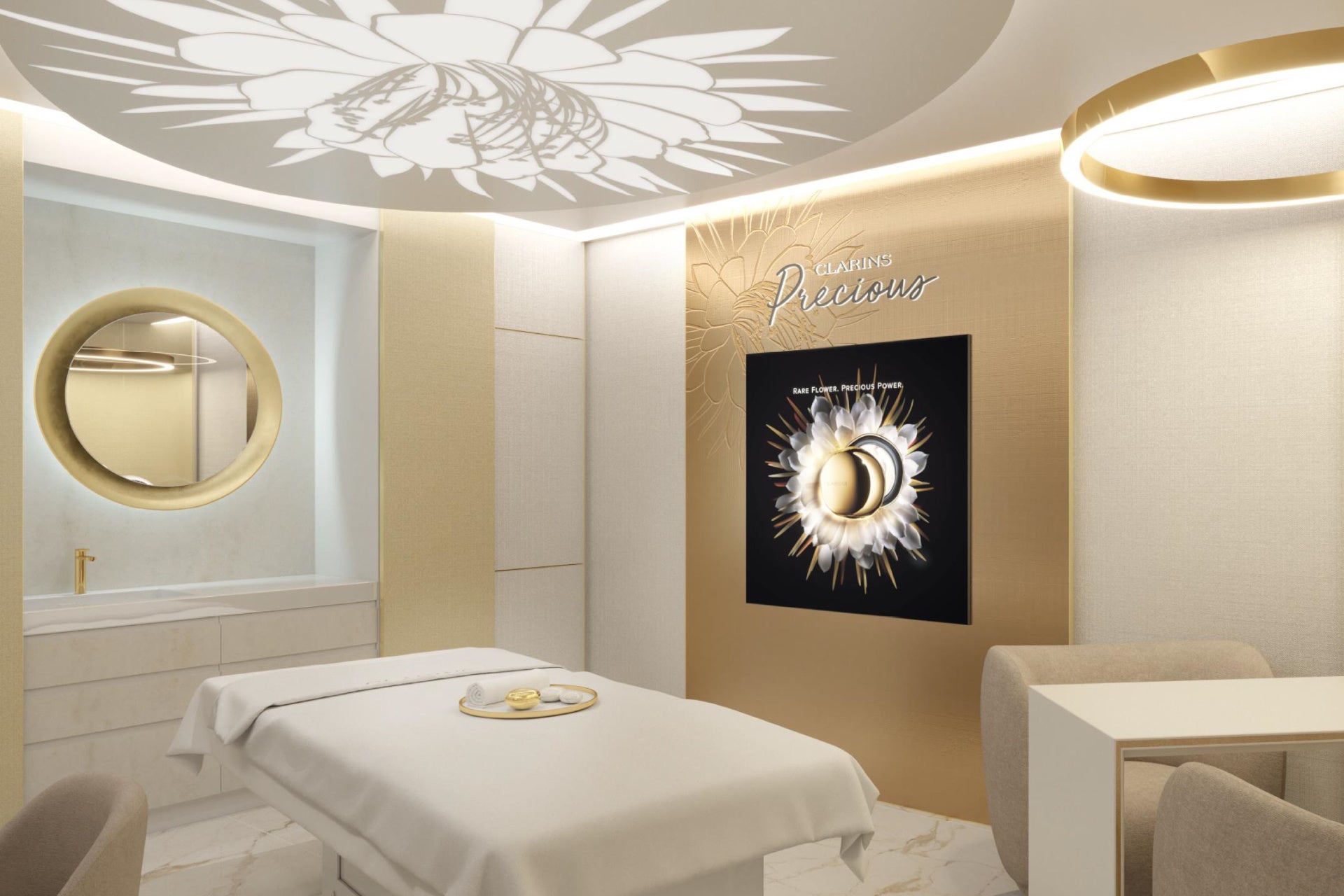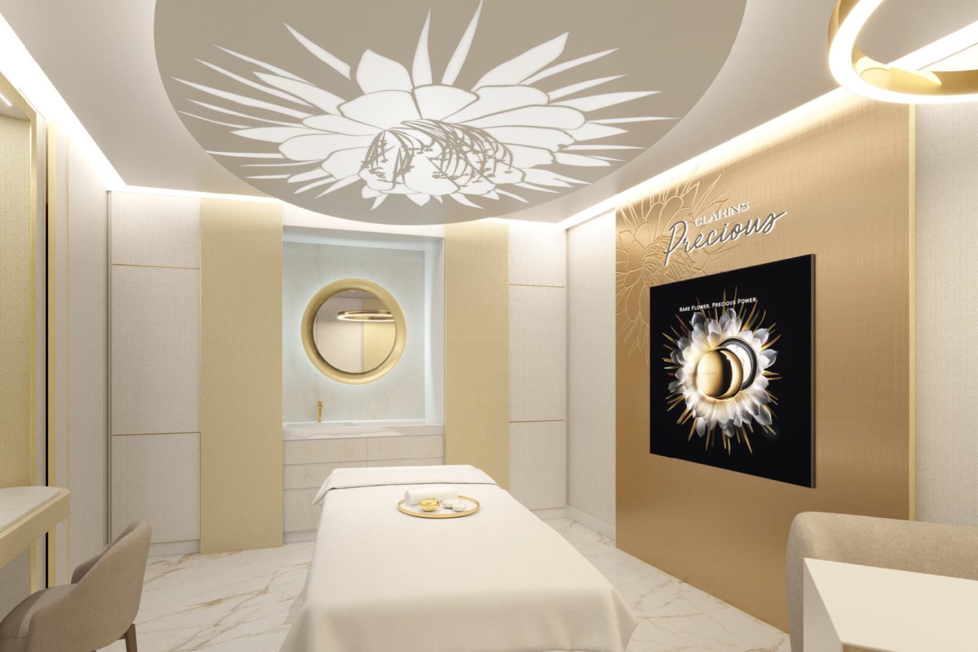 やわらかなゴールドの輝きと、気品あるアイボリーのトーンが溶け合う、”クラランスプレシャス スパ トリートメント”のための特別なスパルーム。