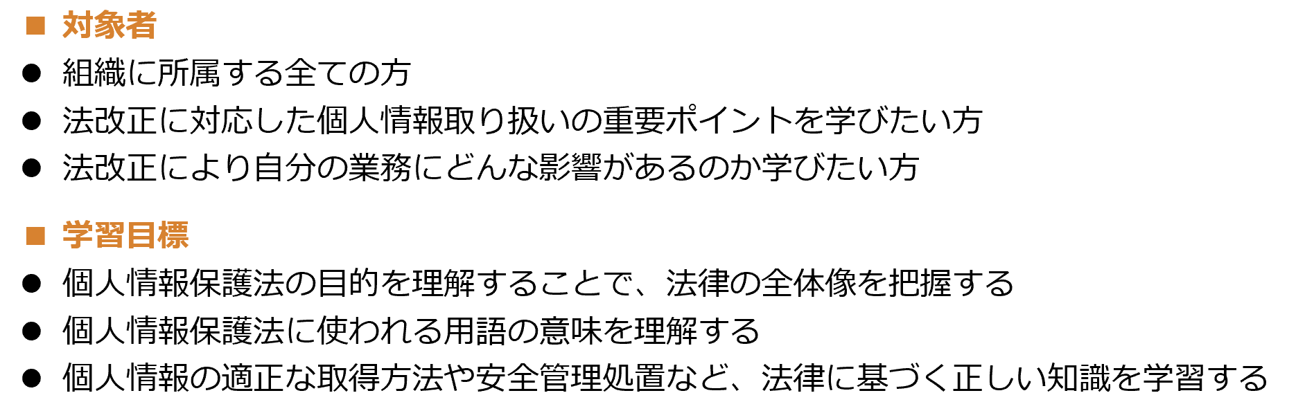 本コースでは、個人情報保護法の基礎知識はもちろん、令和4年(2022年)4月に施行された改正個人情報保護法について、法令や個人情報保護委員会が定めるガイドラインの重要ポイントを圧縮し、具体例と合わせて講師がわかりやすく解説します。特に、仮名加工情報の創設や、漏洩時の報告の義務化など、事業内容に大きく影響を与える改定ですので、コンプライアンス研修の一環として、ぜひご活用ください。
