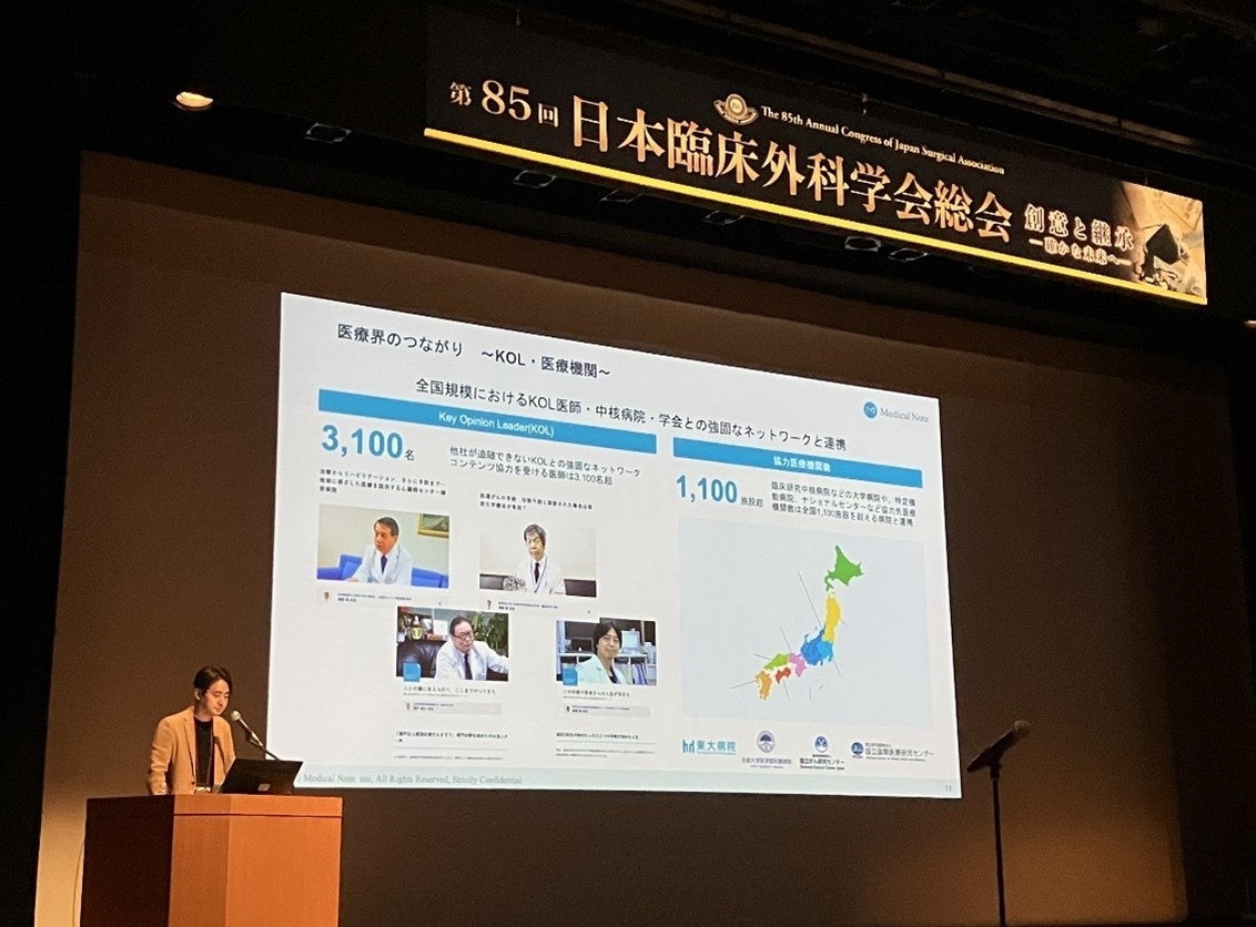 株式会社メディカルノート(東京都港区、代表取締役CEO:梅田 裕真、代表取締役:井上 祥、以下、メディカルノート)は、日本臨床外科学会(東京都千代田区、会長・万代 恭嗣)が、2023年11月16日〜11月18日に開催した第85回日本臨床外科学会総会に、弊社取締役の小林裕貴が登壇したことをお知らせします。