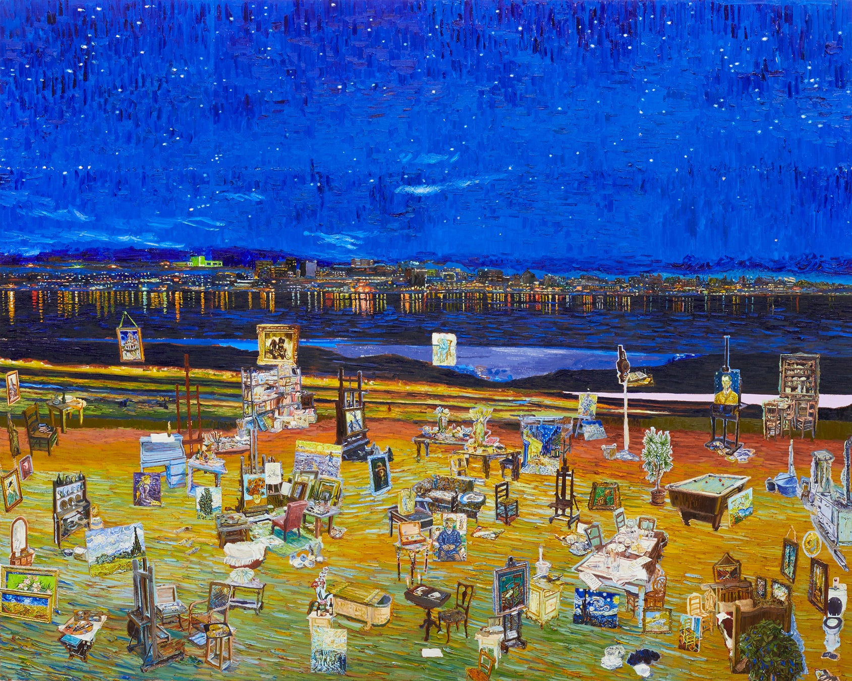 自らのなかに架空の画家を設定し、「その画家に描かせる」という方法で絵画制作をはじめた桑久保徹は、ゴッホのような油絵具による厚塗りの技法を得意としています。《フィンセント・ヴィレム・ファン・ゴッホのスタジオ》は、美術史における巨匠を取り上げて、想像上のアトリエを描き出した〈カレンダーシリーズ〉のなかのひとつです。今日において傑作として知られるゴッホの作品やこの画家にゆかりのある事物が河畔に取り集められている本作品は、星月夜を描いたゴッホの絵画を彷彿とさせます。