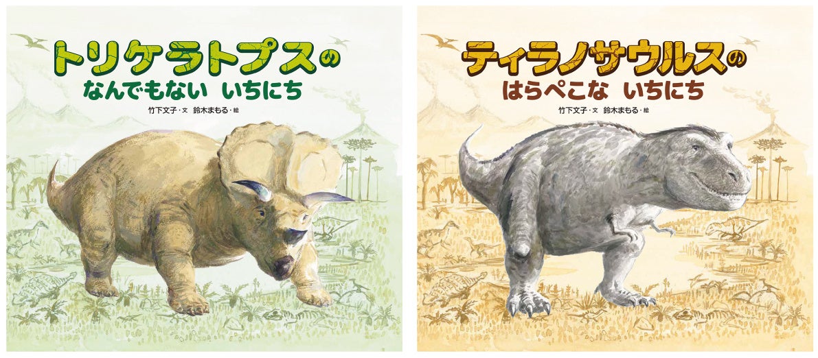 『トリケラトプスのなんでもないいちにち』『ティラノサウルスのはらぺこないちにち』(いずれも竹下文子 作/鈴木まもる 絵)は、白亜紀後期(約7000万年前)を生きた肉食恐竜ティラノサウルスと、草食恐竜トリケラトプスそれぞれの視点から、ある同じ1日を描いた絵本。2020年に同時刊行された当時から話題を呼び、同じコンビが描いた、はたらく車たちが主役の「のりもの絵本」シリーズにつづく人気絵本となりました。