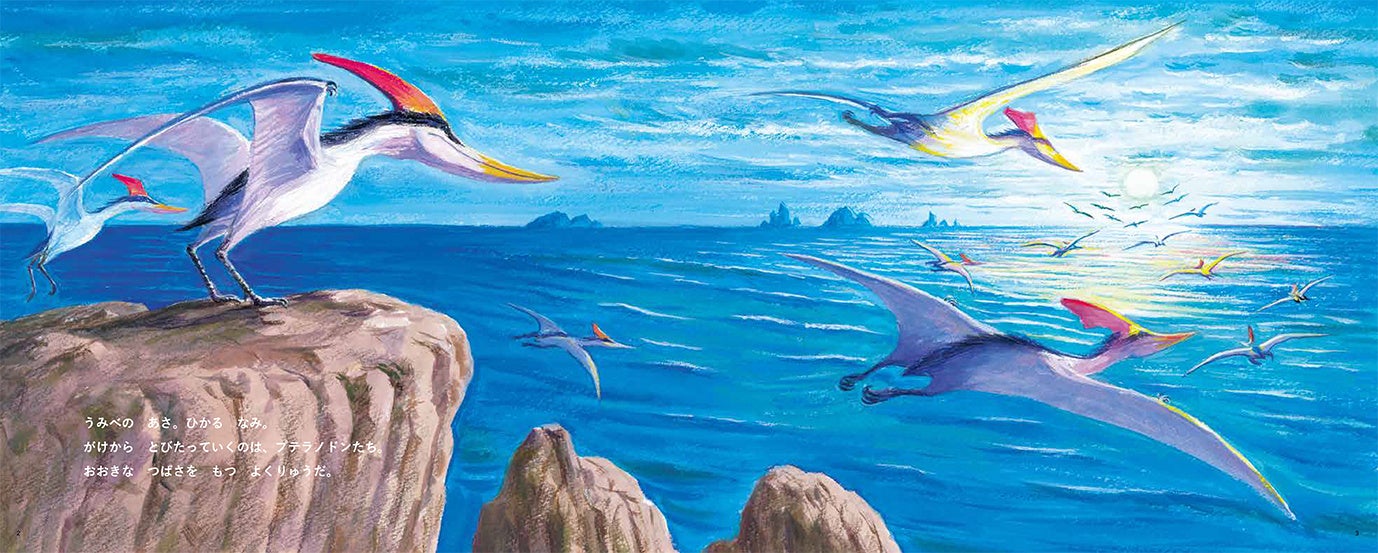 朝、海辺の崖で目が覚めたプテラノドンたち。腹ごしらえをするために、空を悠々と飛んで、魚の群れを探します。