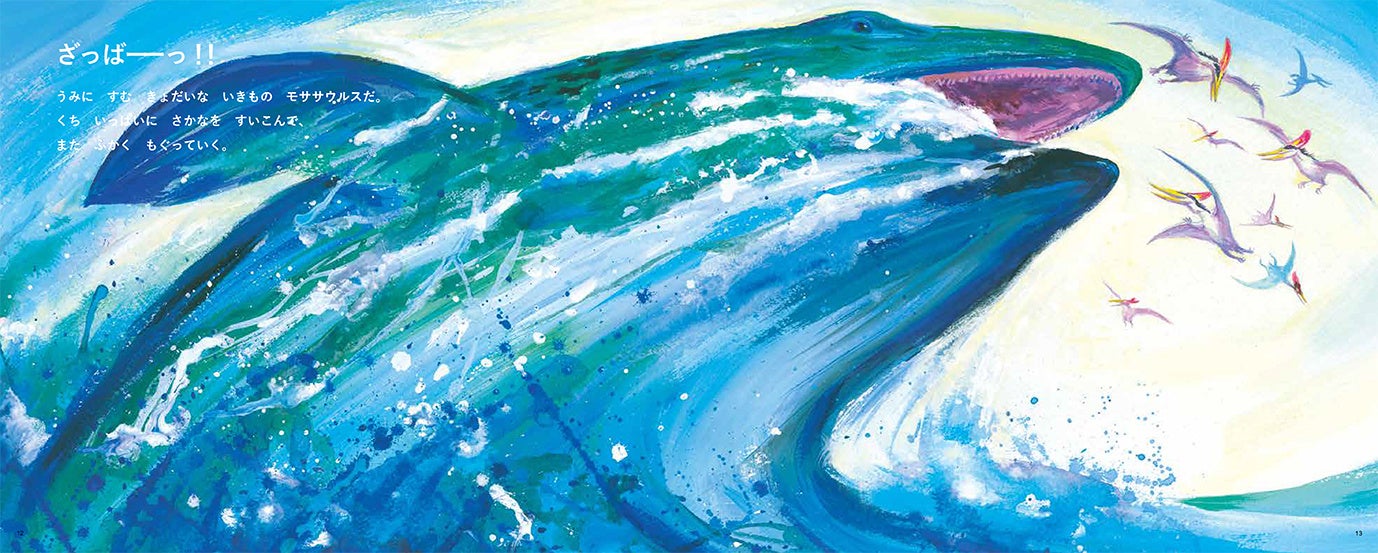 また、同じ時代の海生爬虫類の一種、モササウルスの大迫力のシーンも! モササウルスは、ティラノサウルスを食すともいわれる、白亜紀後期の海の頂点捕食者(食物連鎖の頂点にいる肉食動物)です。